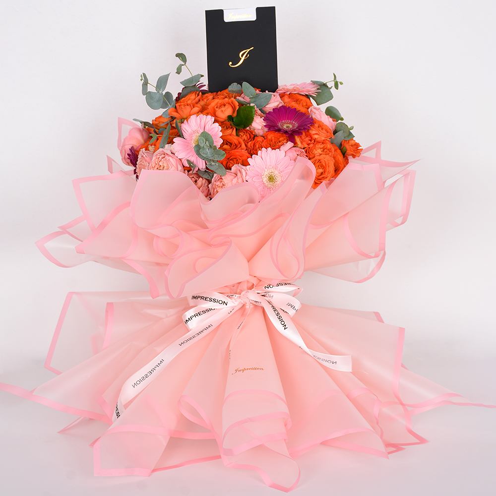 Two-in-one flower design in mixed baby roses with our Belgian chocolates.
