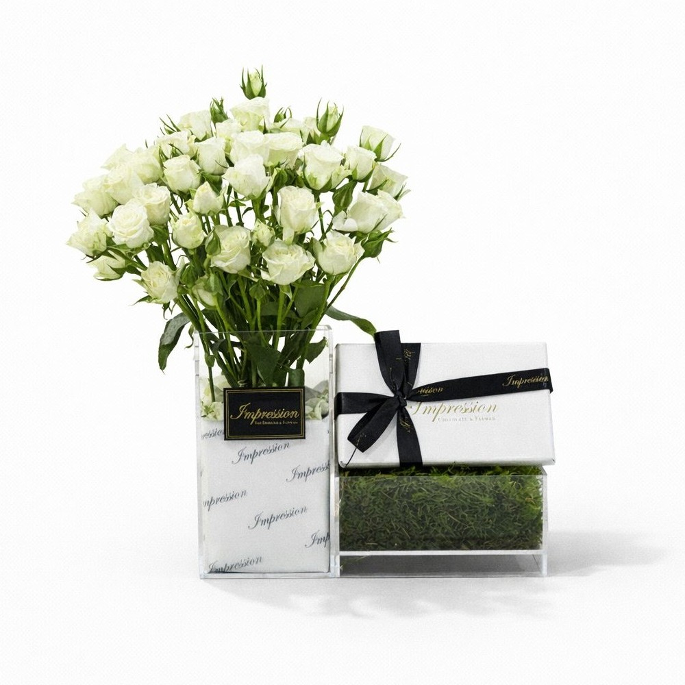 A carefully arranged bouquet of pure white baby roses, accompanied by a luxurious box of chocolates, a perfect blend of beauty and delight.