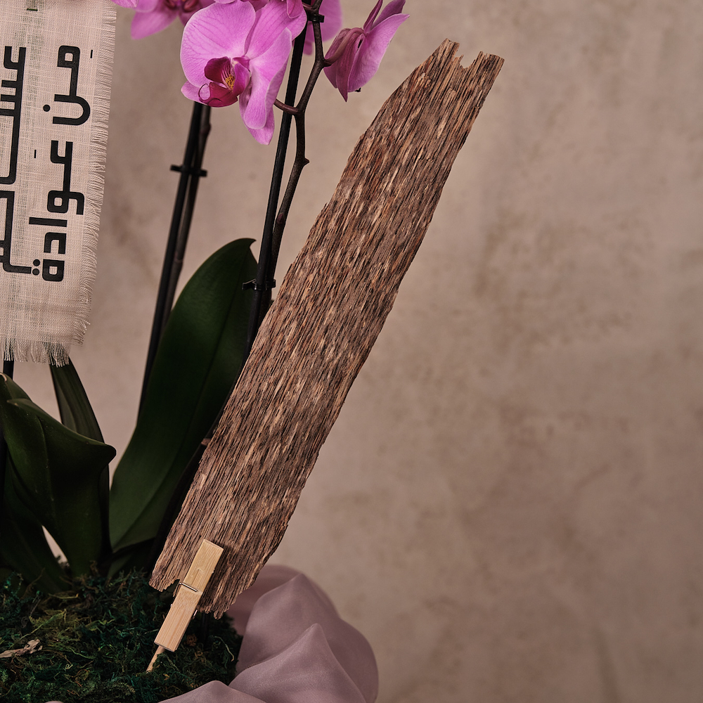 A natural orchid plant with 3 blooming stems in a violet shade, elegantly arranged in a fabric-wrapped pottery pot and finished with Ramadan crescent details, includes bukhour and a message card to complete Ramadan Niqsa. Note: the greens at the bottom of the orchids are artificial.