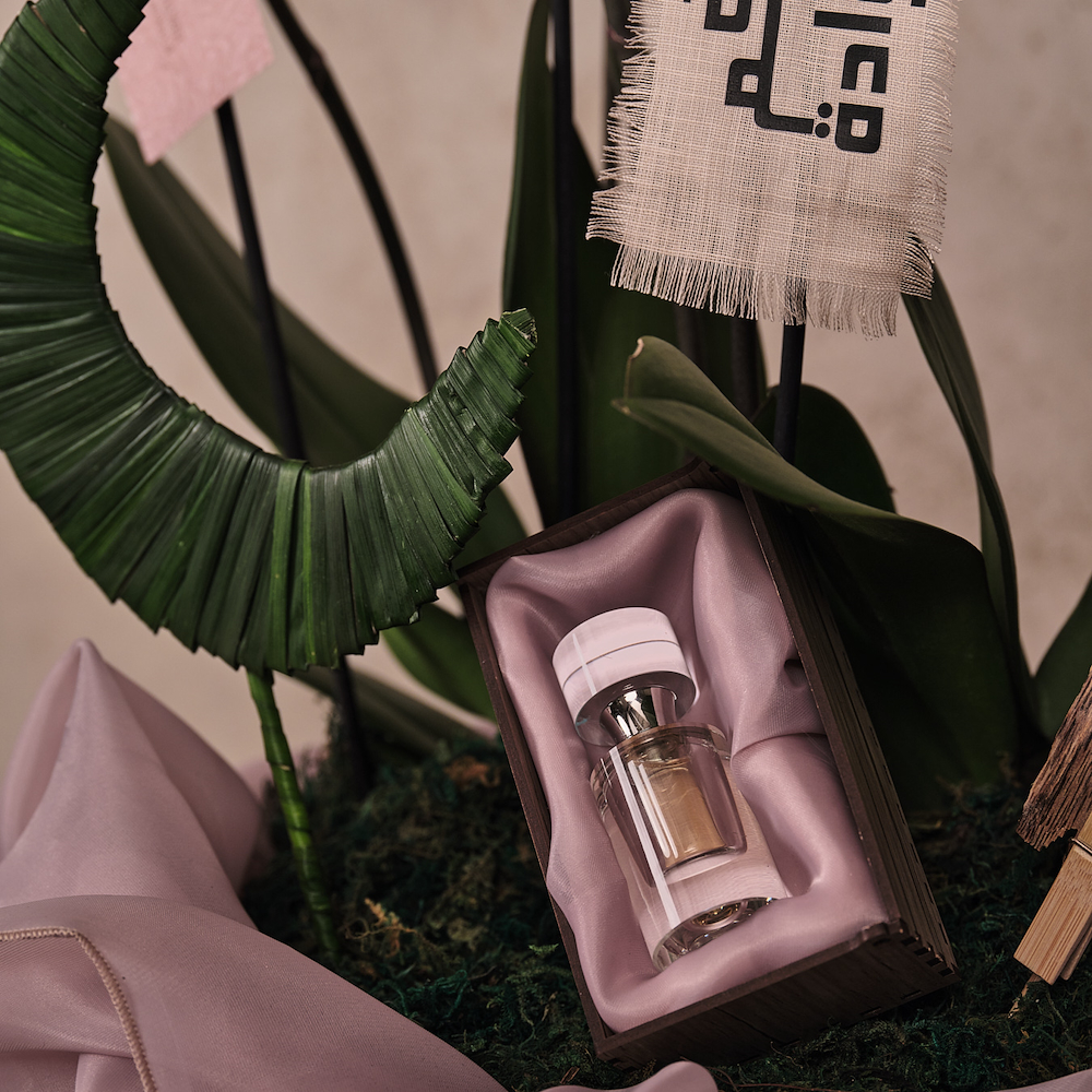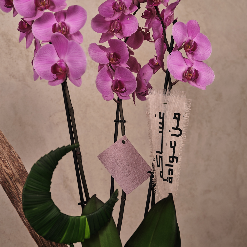 A natural orchid plant with 6 blooming stems in a violet shade, elegantly arranged in a fabric-wrapped pottery pot and finished with Ramadan crescent details, includes bukhour and a message card to complete Ramadan Niqsa. Note: the greens at the bottom of the orchids are artificial.