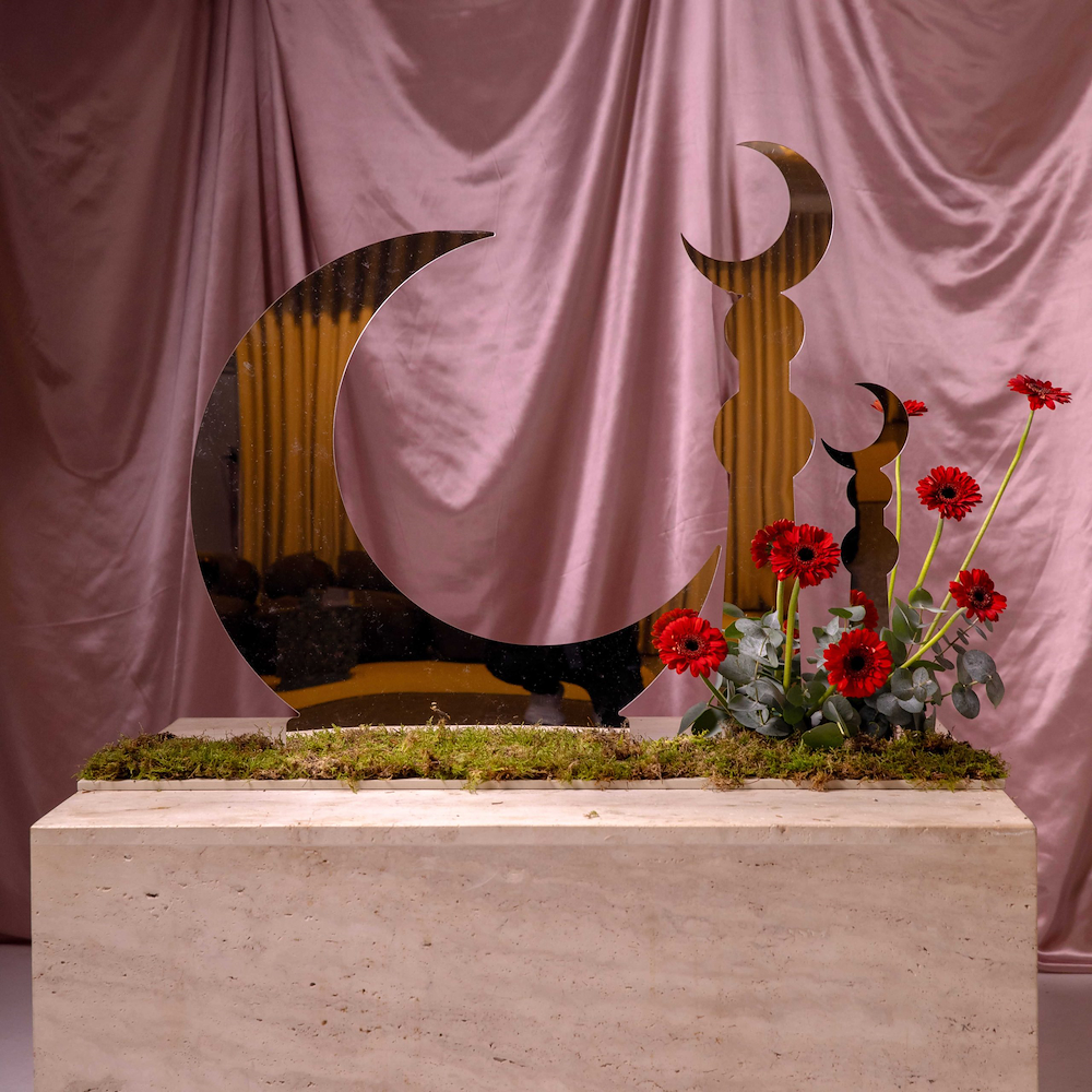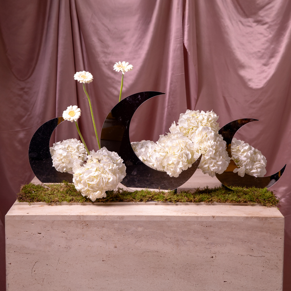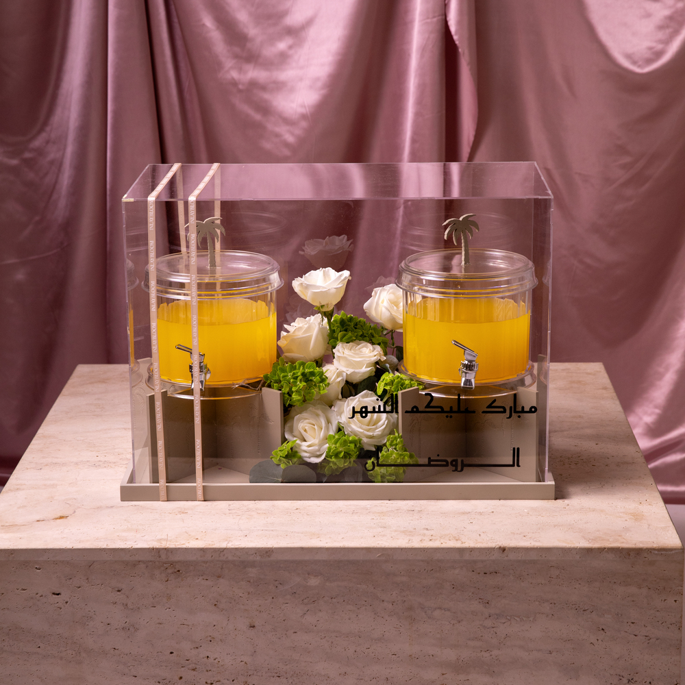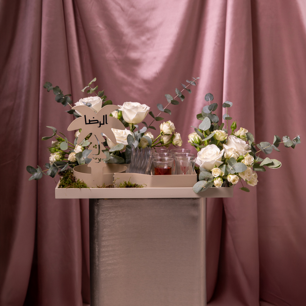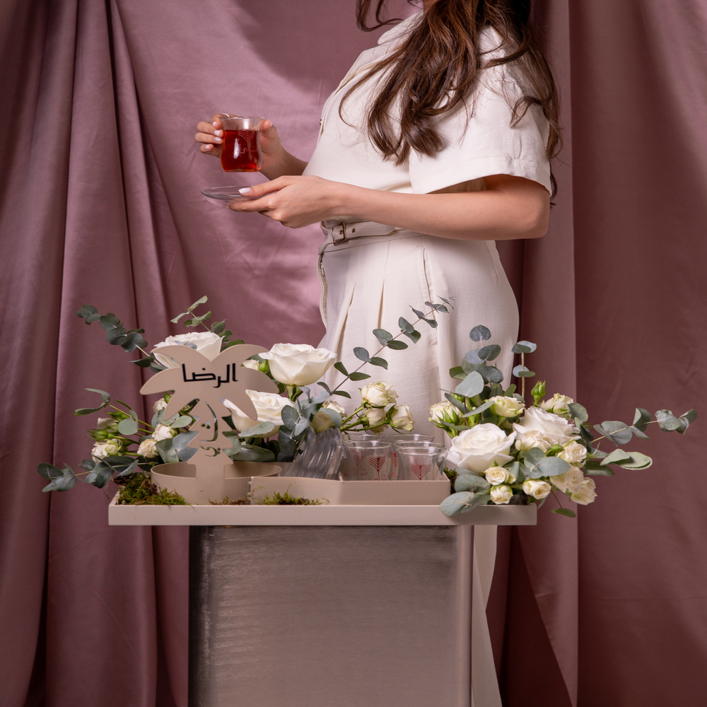 A tray featuring white roses and baby roses with 6 tea cups set and customized name.