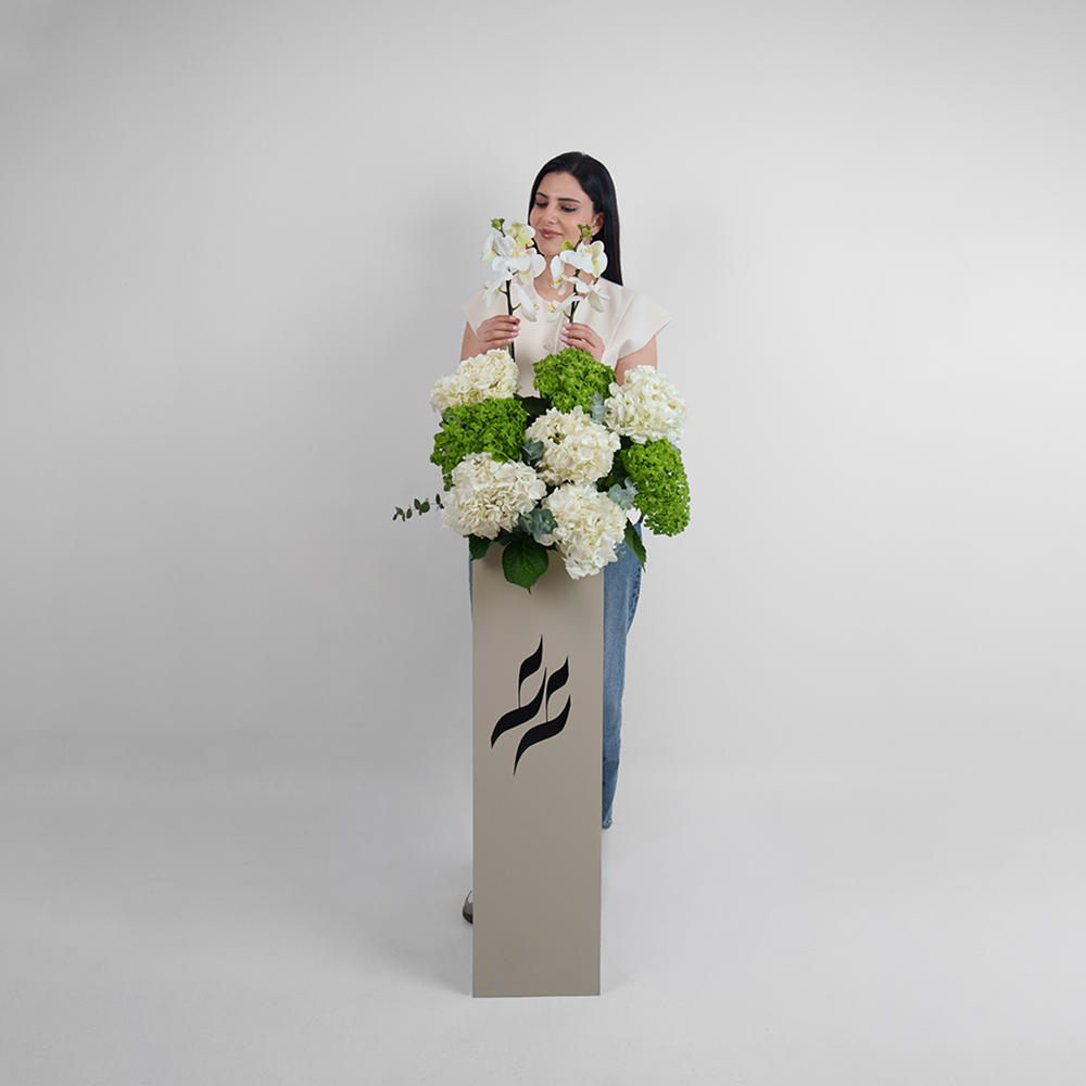 A lush, tall green floral arrangement that brings vibrant greenery and fresh botanical charm to any space, making it perfect for elegant décor or stylish gifting. The bouquet contains hydrangeas and orchids. You can write 2 letters on it.