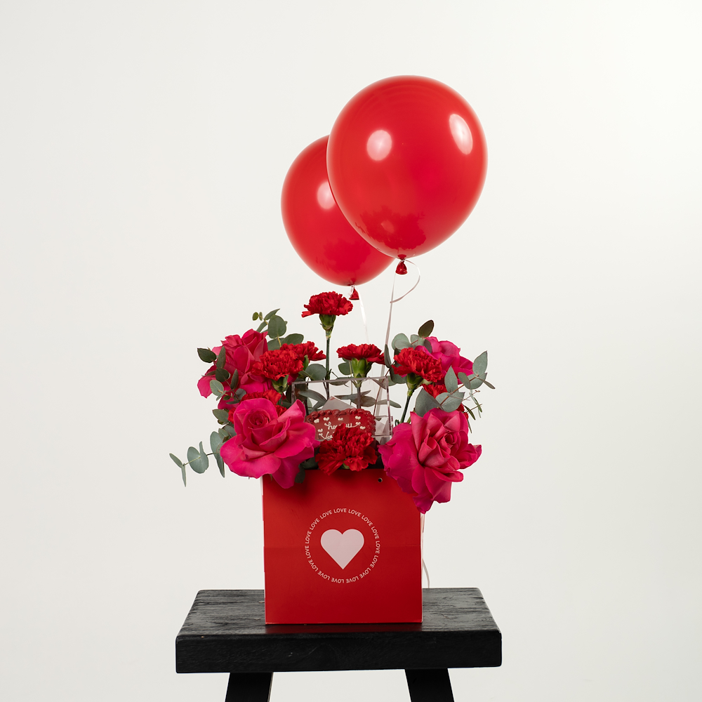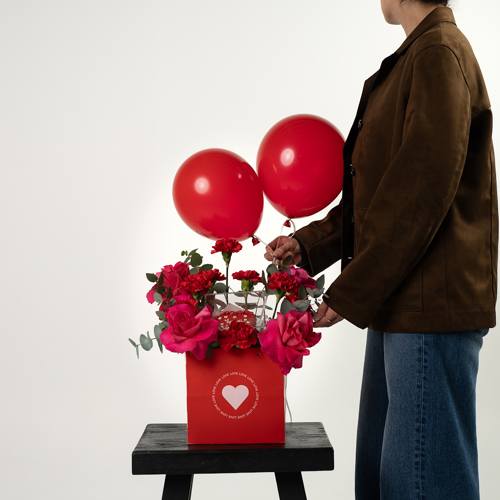 A bouquet containing roses and carnations with 2 balloons and a cake, arranged beautifully in a bag.