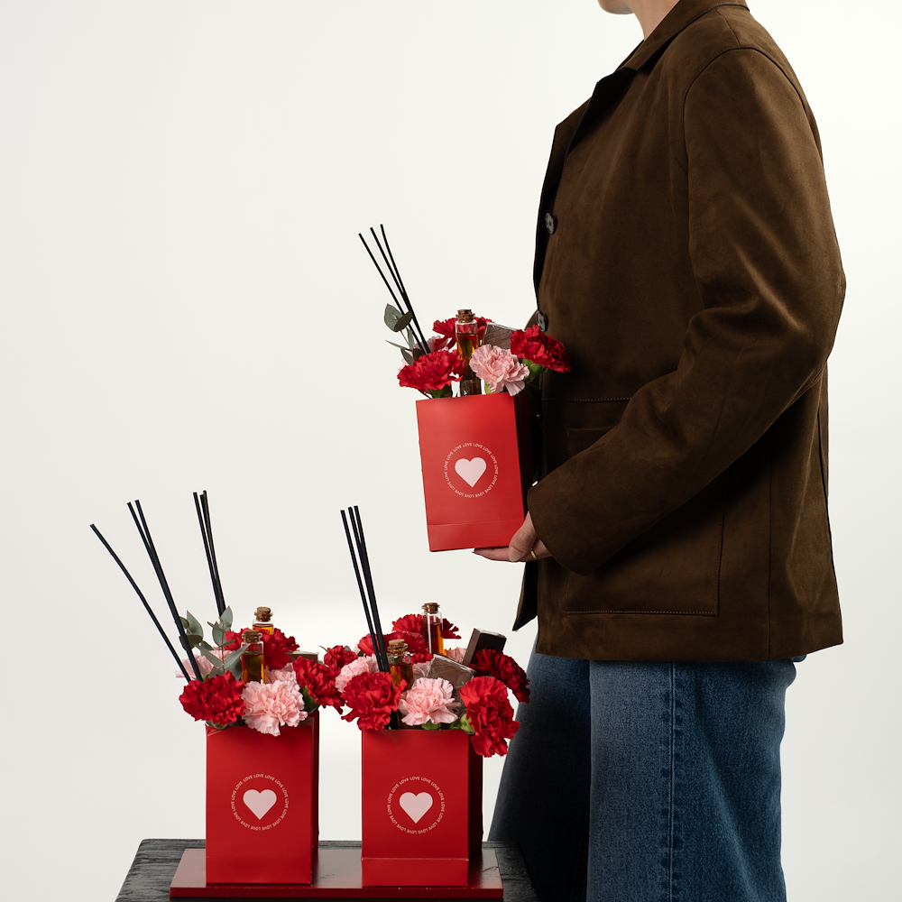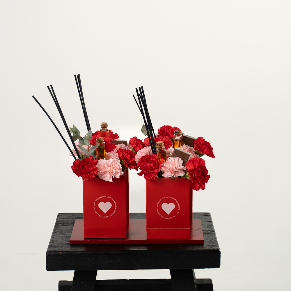 5 single bags each contain 1 chocolate and 20ml amber diffuser and flowers.
