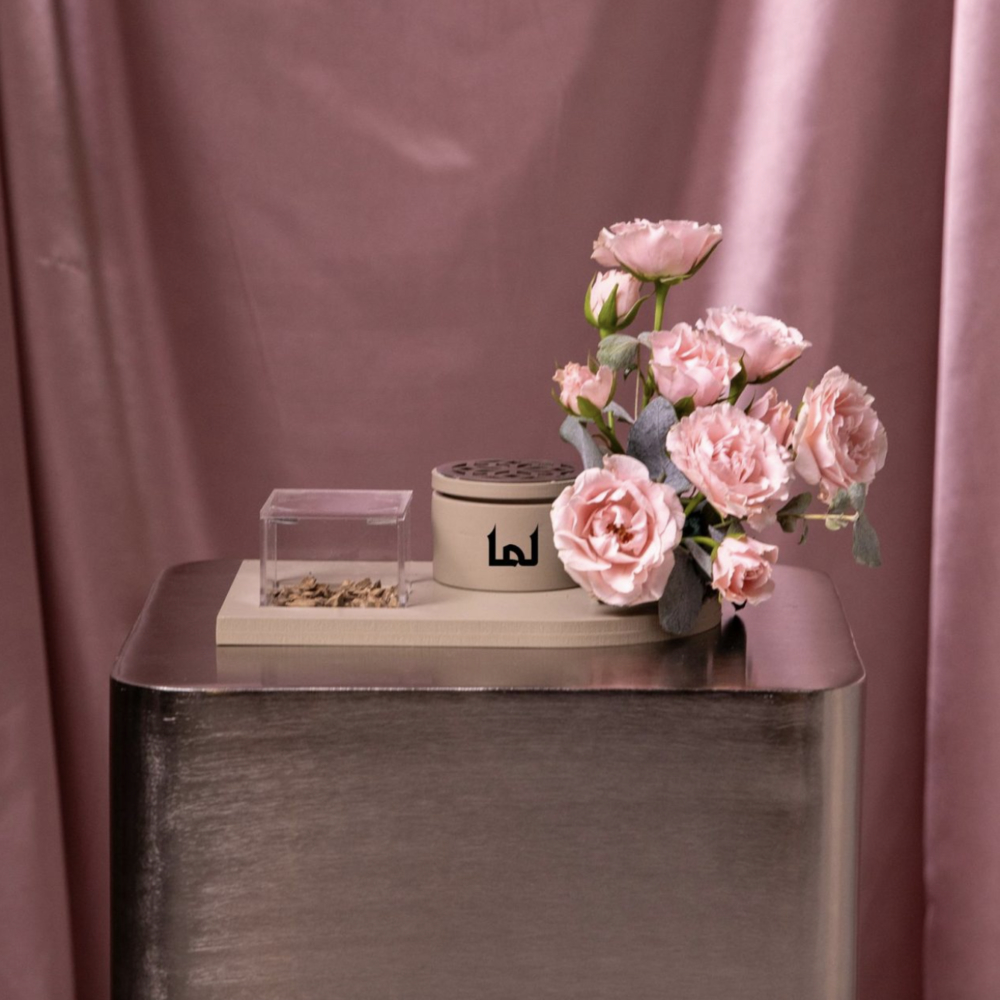 A tray featuring pink roses with name customized mini mubkhar and bokhour.