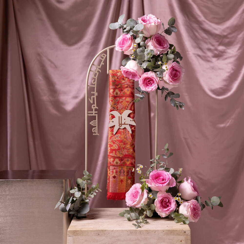 A stand beautifully arranged with roses, paired with a black shawl personalized with a custom name. A thoughtful and elegant gift, perfect for showing love and care.