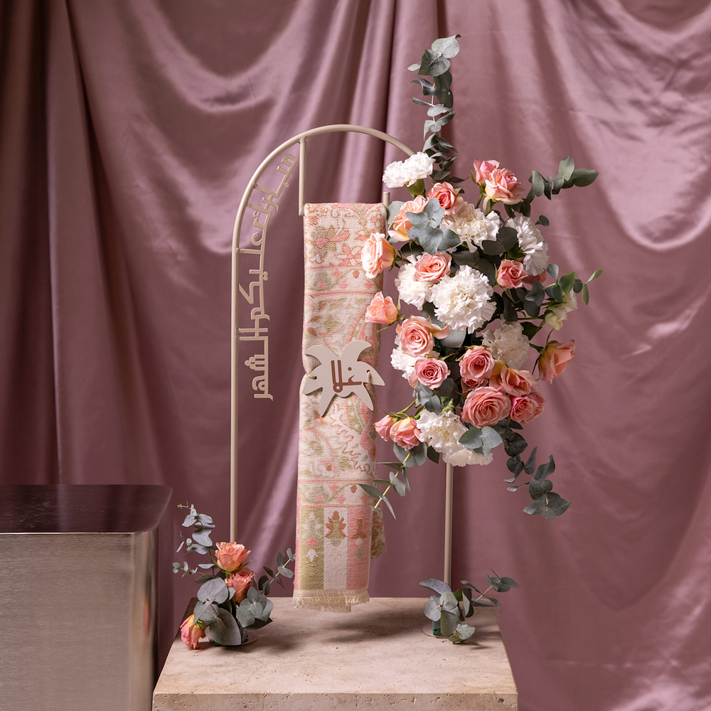 A stand beautifully arranged with baby roses and carnations, paired with a taupe shawl personalized with a custom name. A thoughtful and elegant gift, perfect for showing love and care.