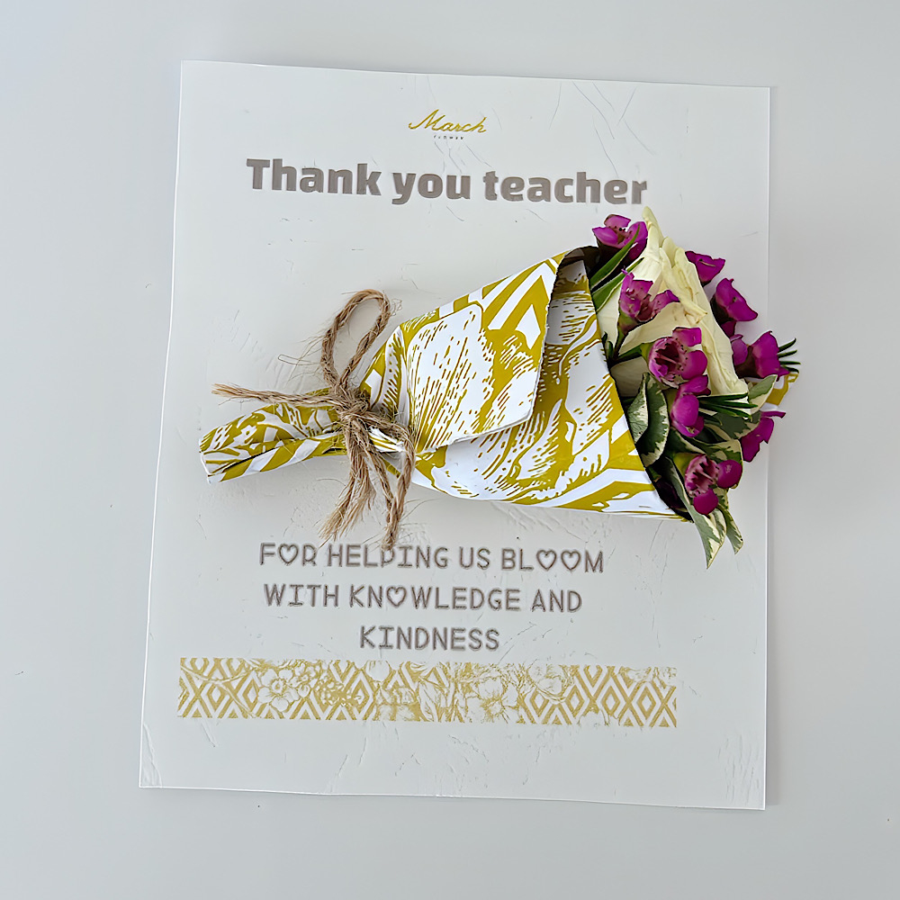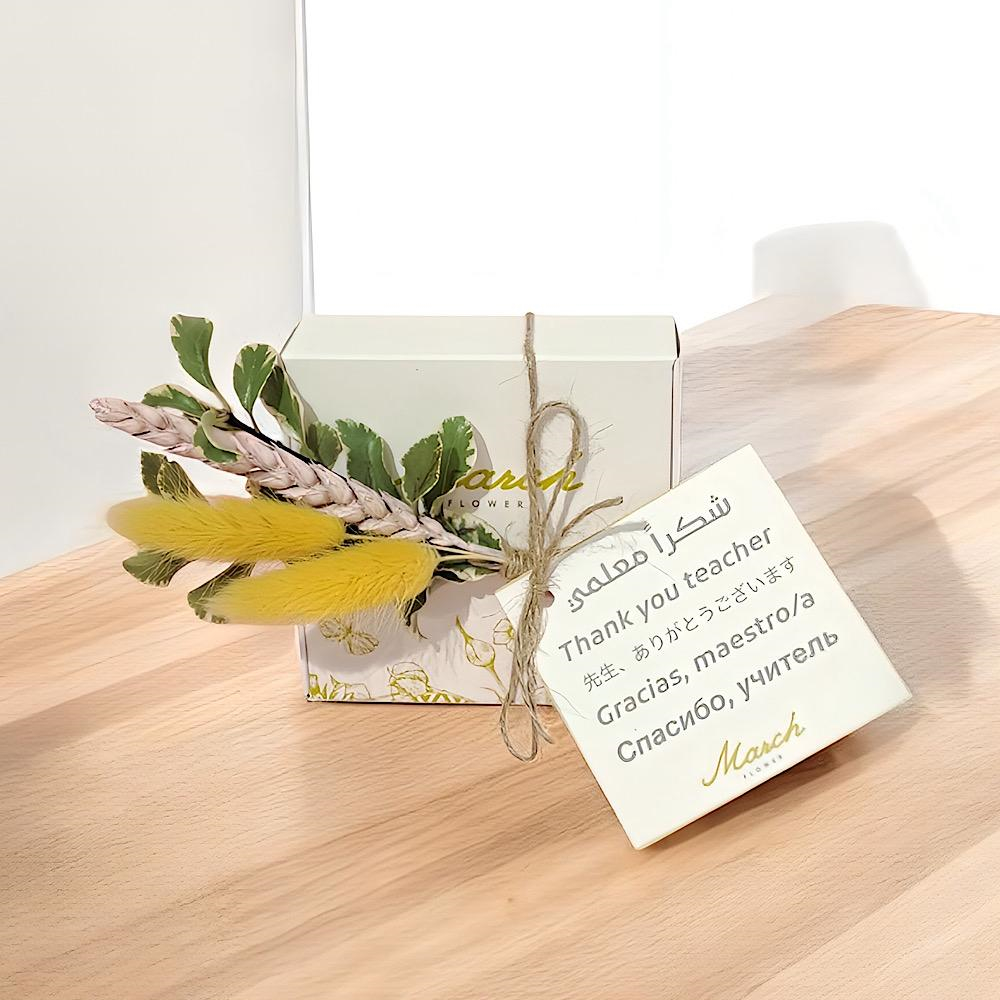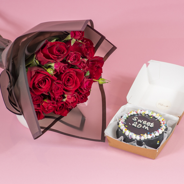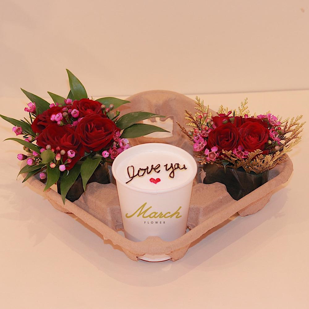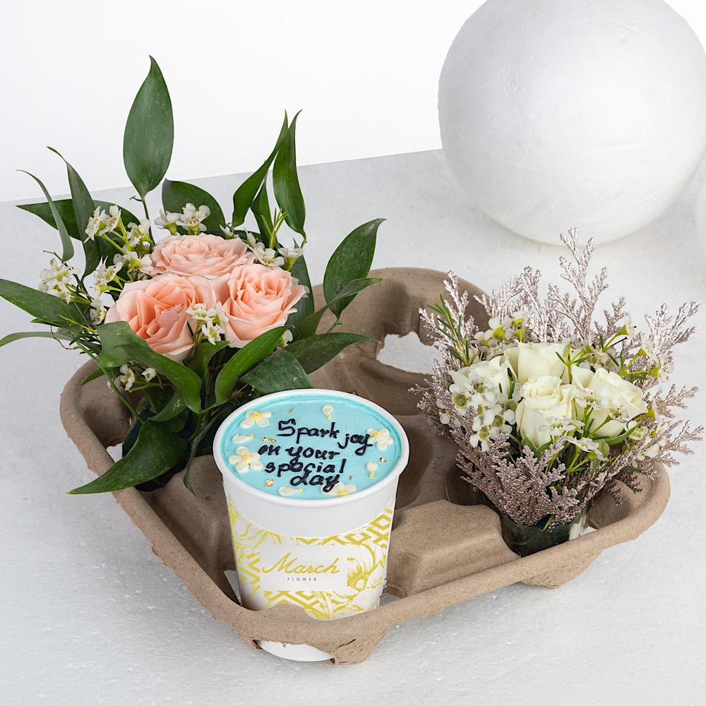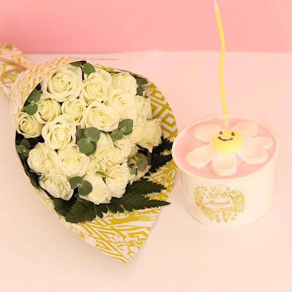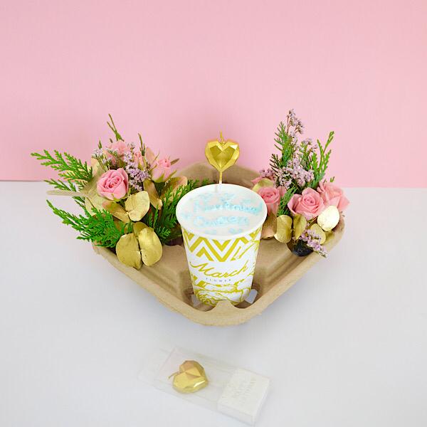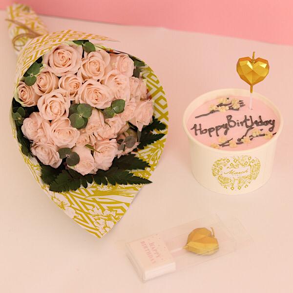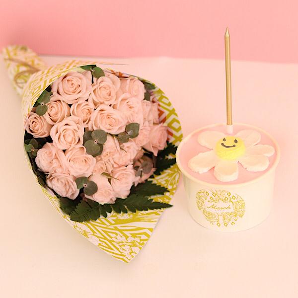 A bouquet contains baby roses and wax and gold eucalyptus and a cake in cup with candle.