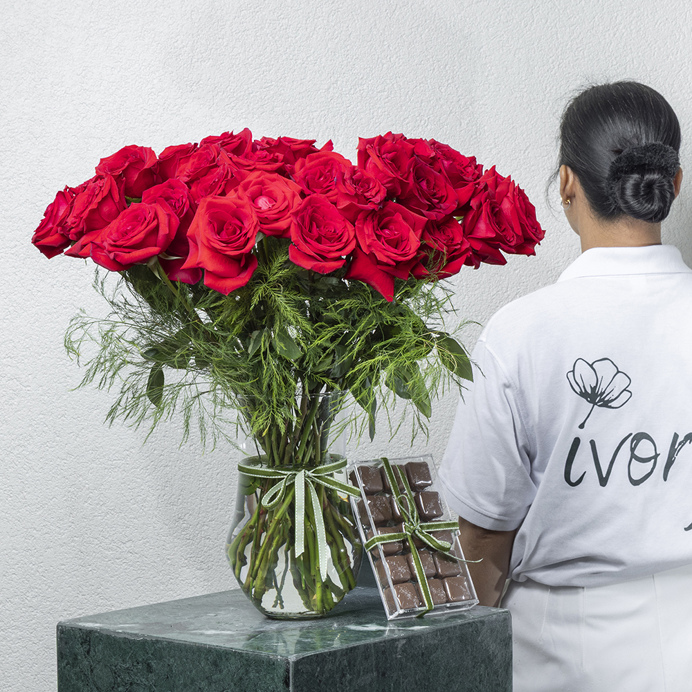 An elegant vase featuring 25 red roses, in a lovely theme with chocolates.