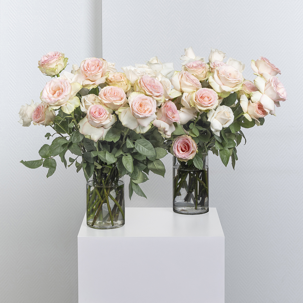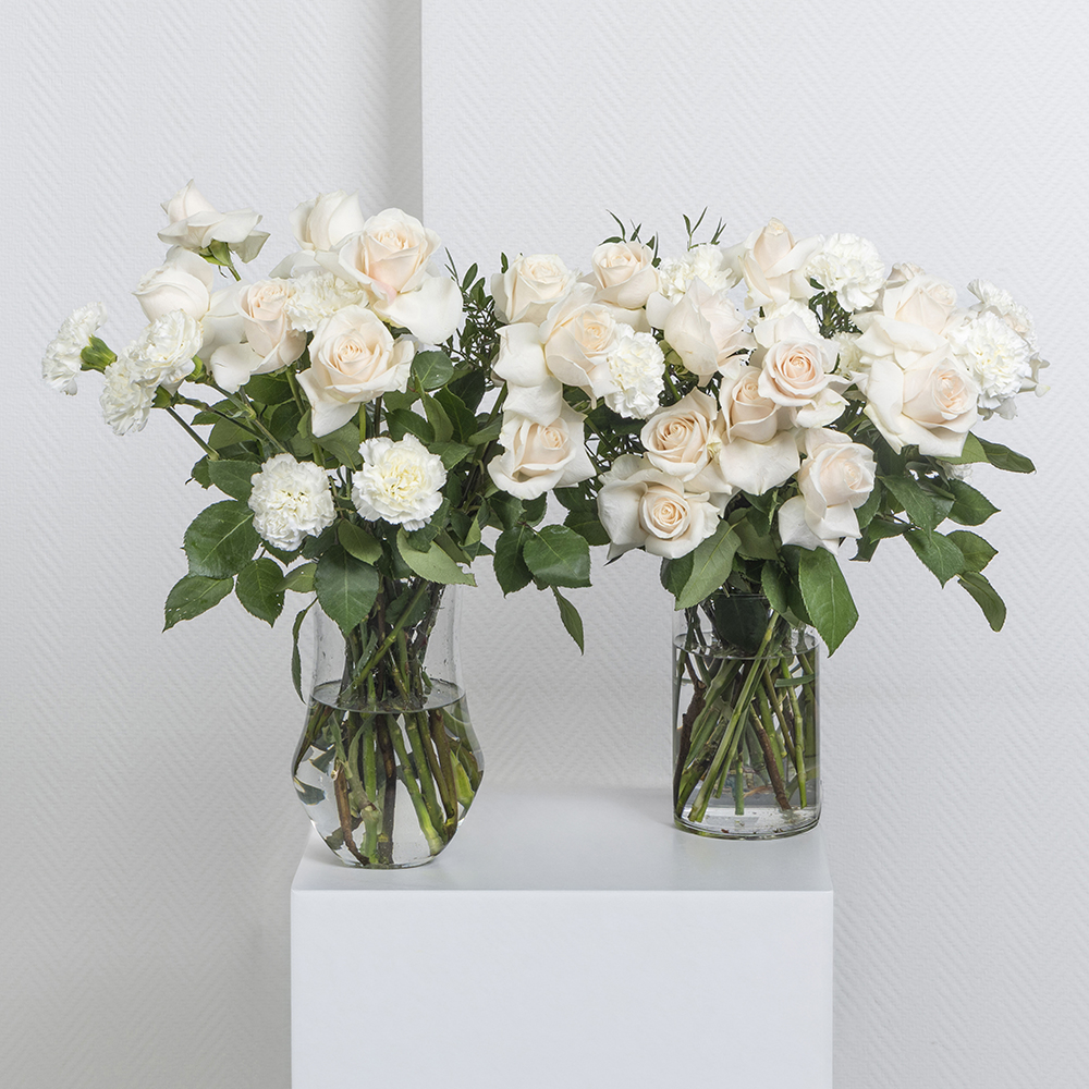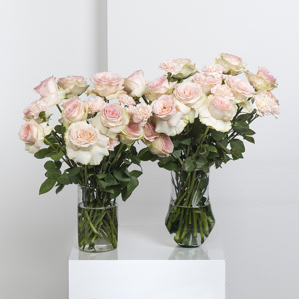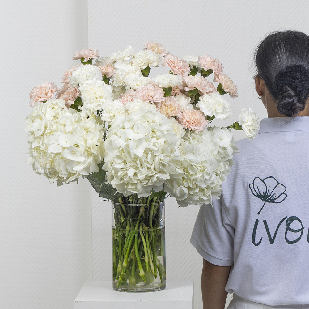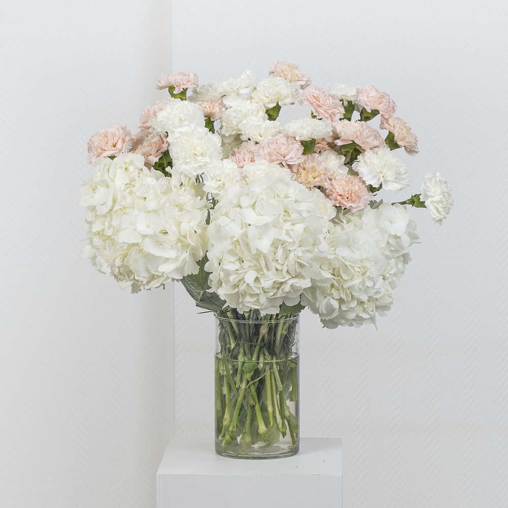 A bouquet containing carnations and hydrangeas, arranged beautifully in a glass vase.