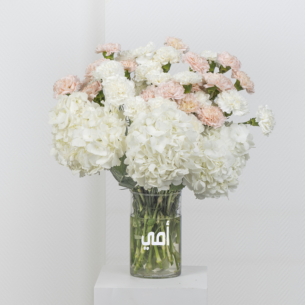 A bouquet containing carnations and hydrangeas, arranged beautifully in a glass vase.