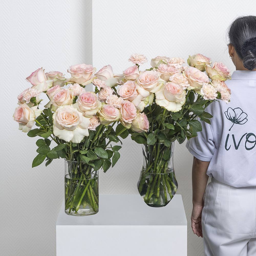 A set of 2 vases, each arranged with 25 roses and carnations in a lovely arrangement.