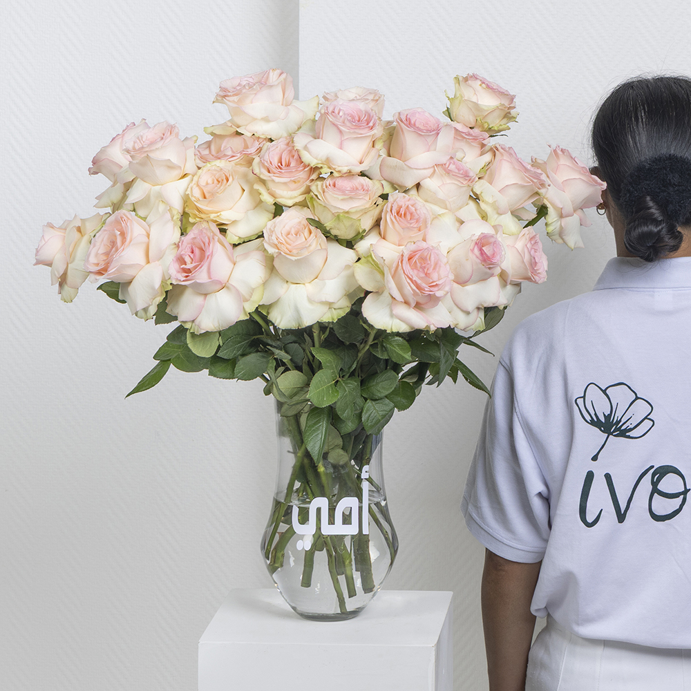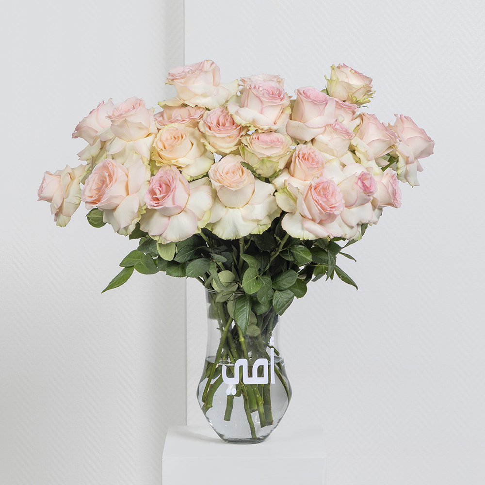 A bouquet containing 25 pink roses, arranged beautifully in a vase.