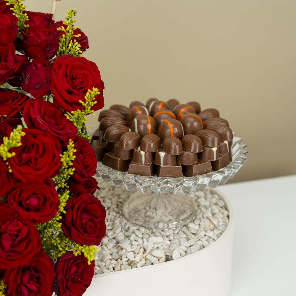 This bouquet contains baby roses with chocolates.