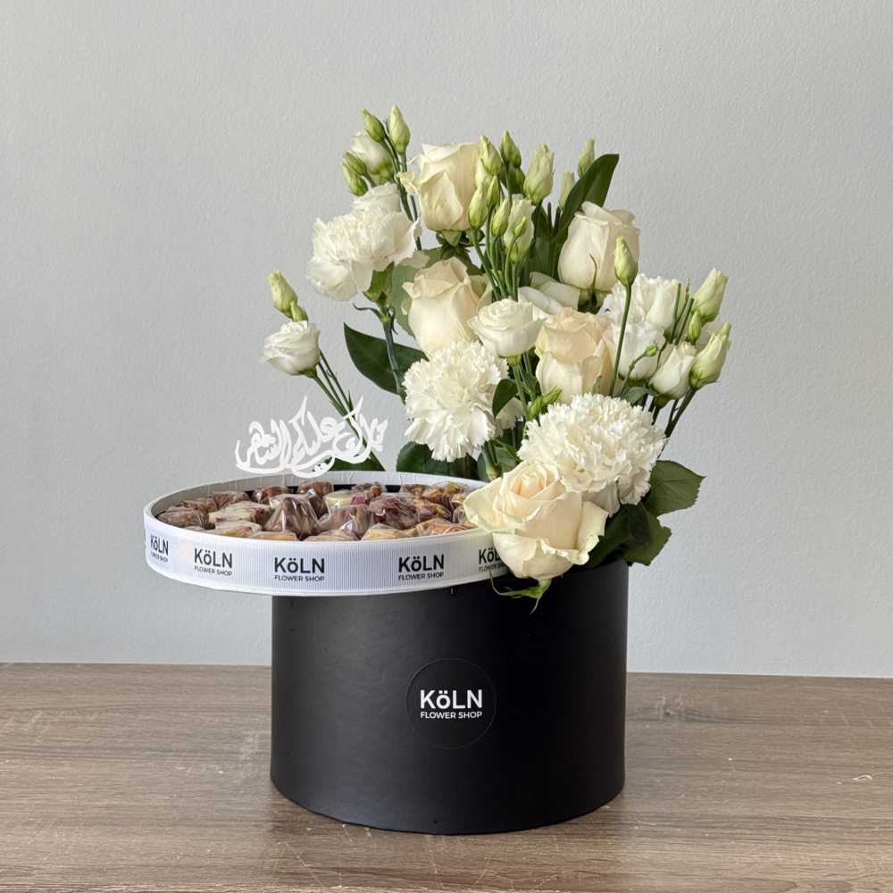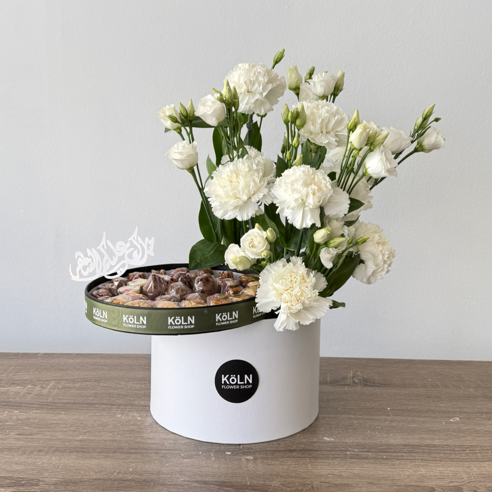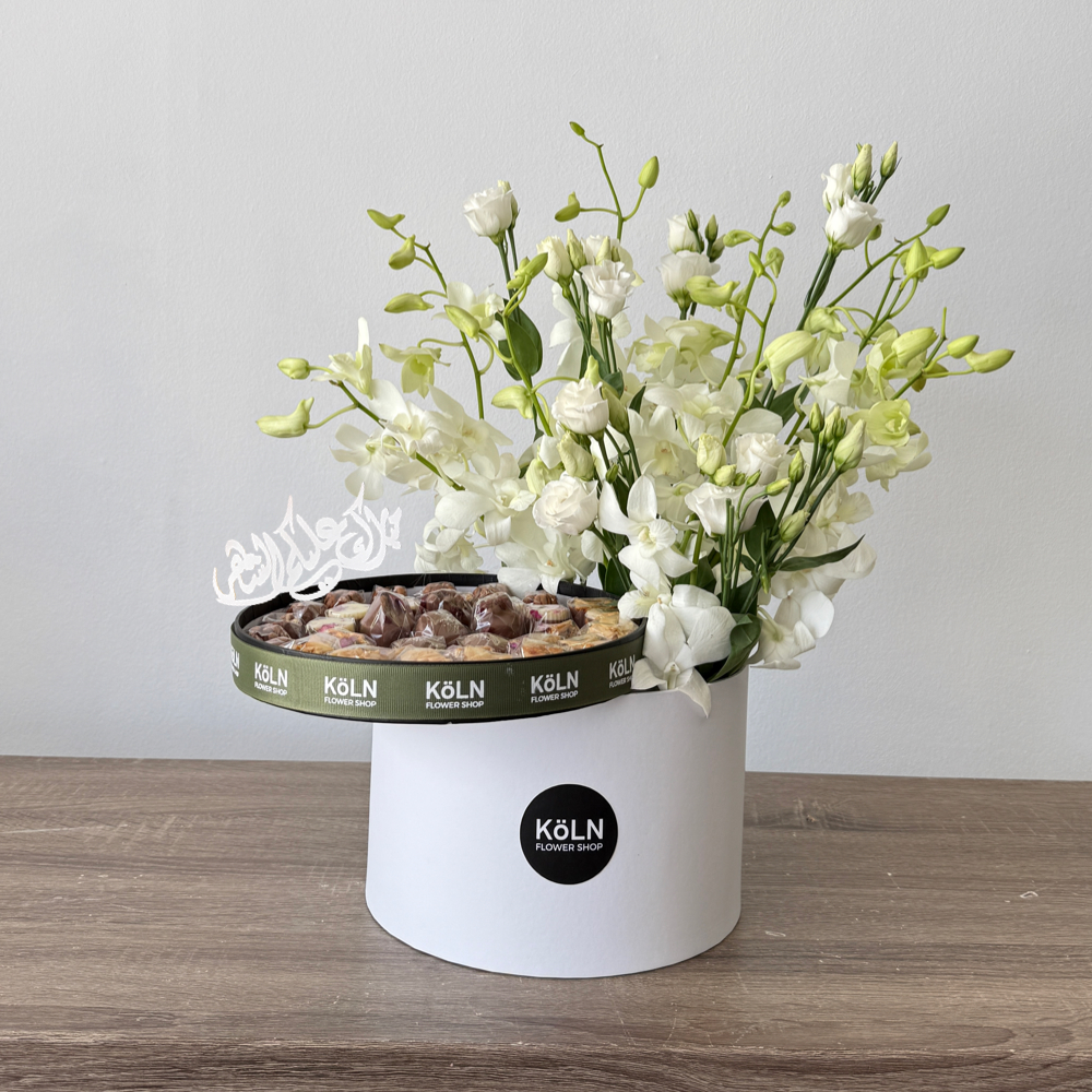 A vase that contains casablanca flowers with Belgian chocolates.