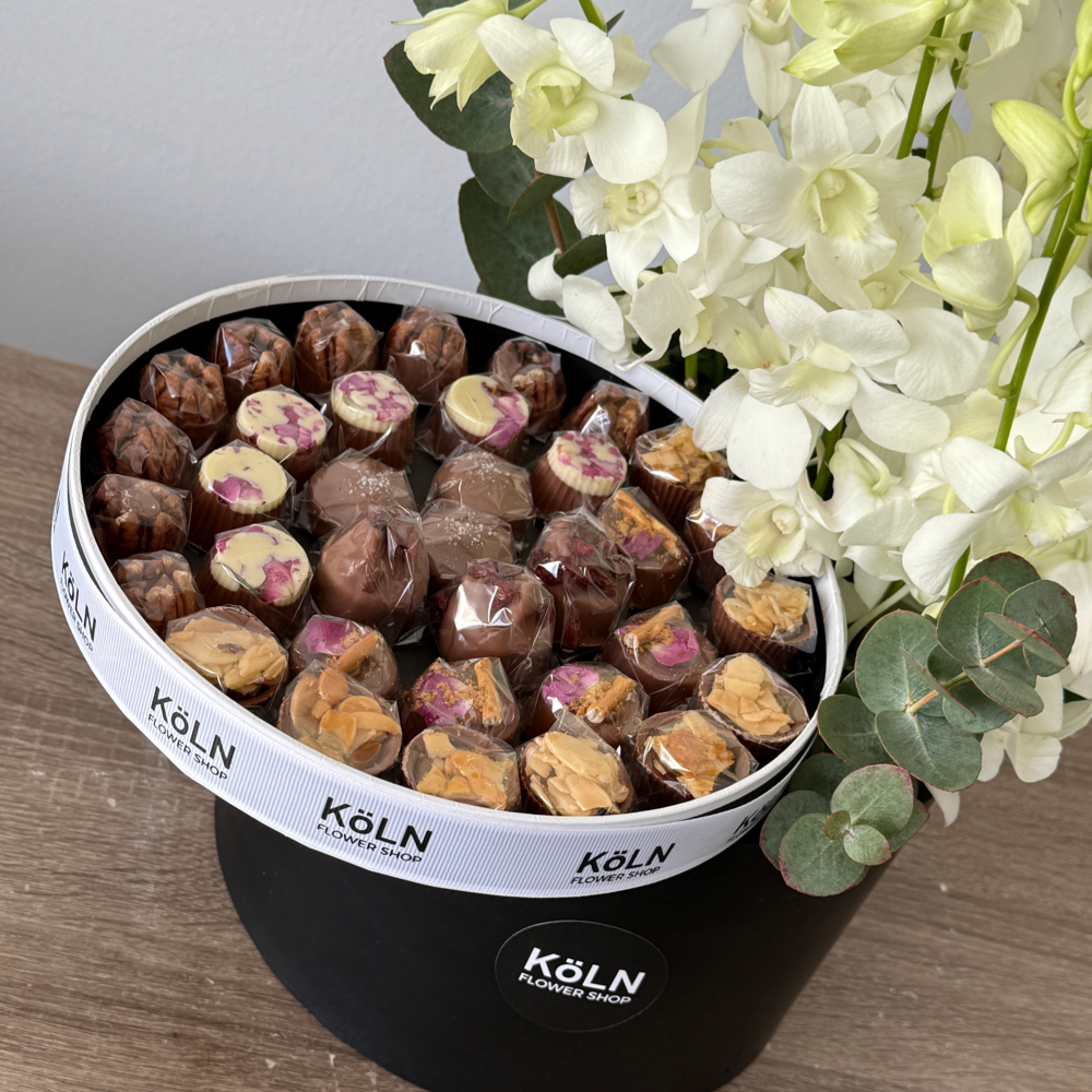 This beautiful bouquet contains baby orchids with luxurious Belgian coffee sweets.