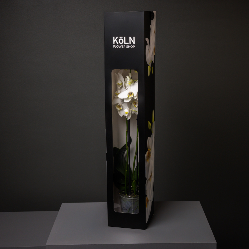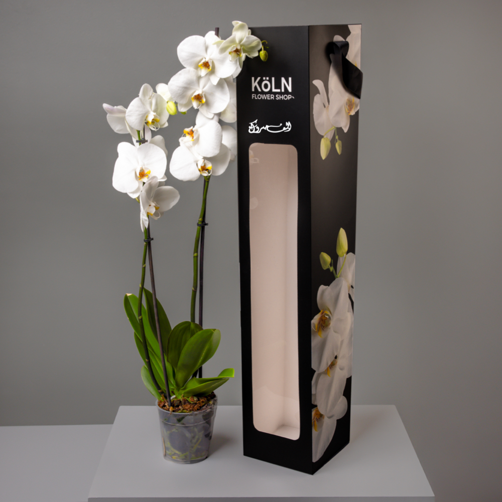 A bouquet of phalaenopsis orchid plants with a bag in an elegant design.
