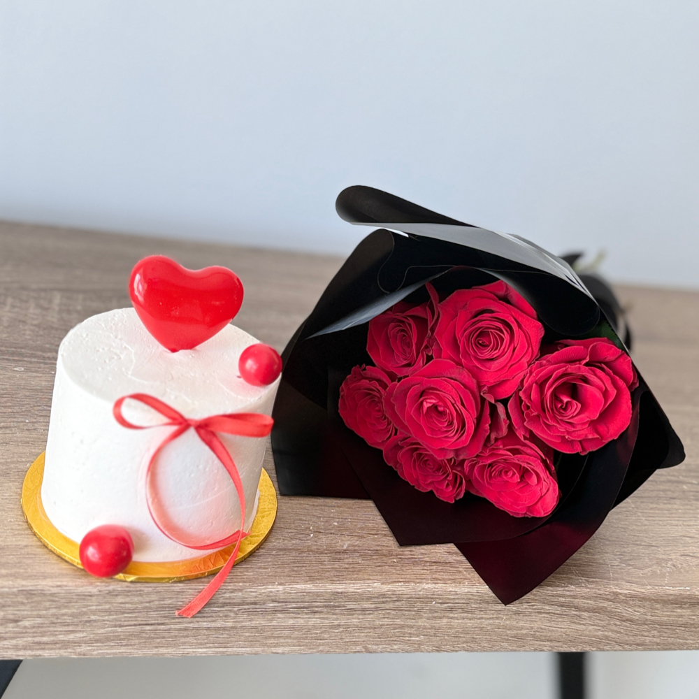 A hand bouquet containing roses with a delicious and beautiful cake.