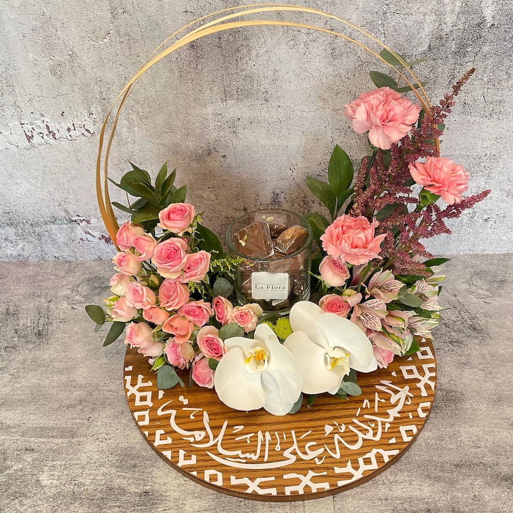 A wooden tray beautifully arranged with baby roses, orchids, carnations, and alstroemerias with chocolates.
