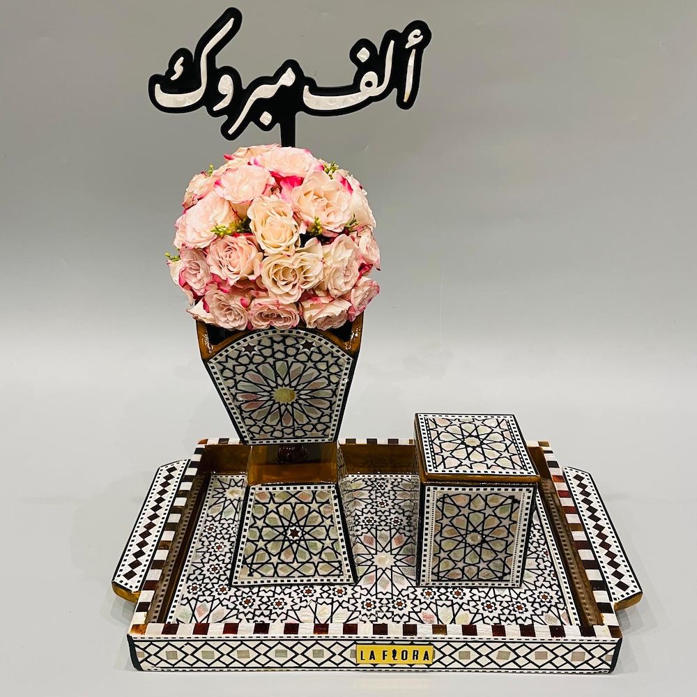 A stand with red roses and blue lights. A doll-shaped figure carrying a balloon made of gypsum.