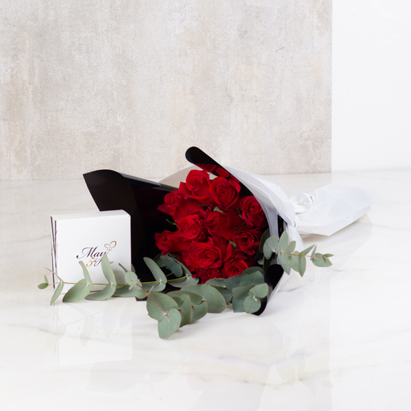 Red hand bouquet arrangement contains roses and eucalyptus with box of Belgian chocolates.