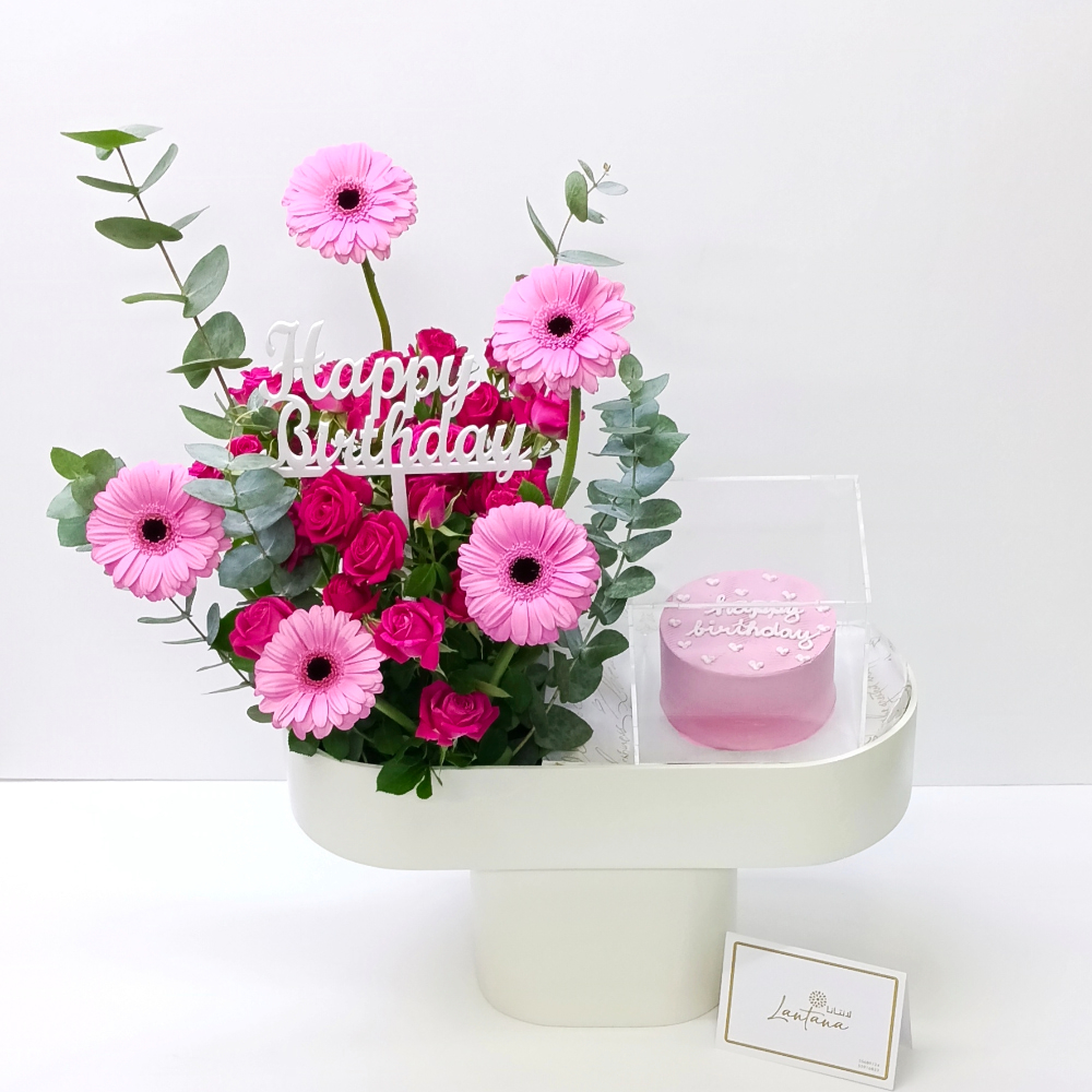 This bouquet arrangement contains gerbera and roses with a vanilla mini cake.