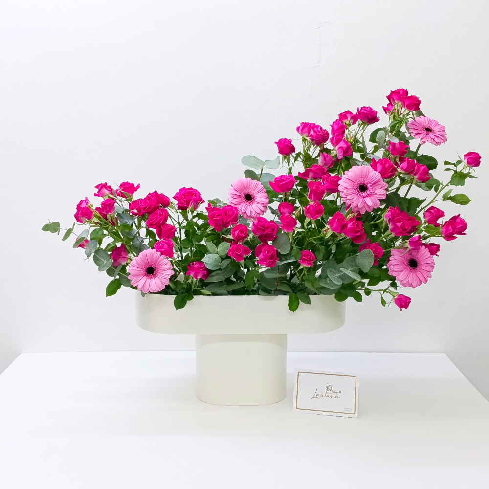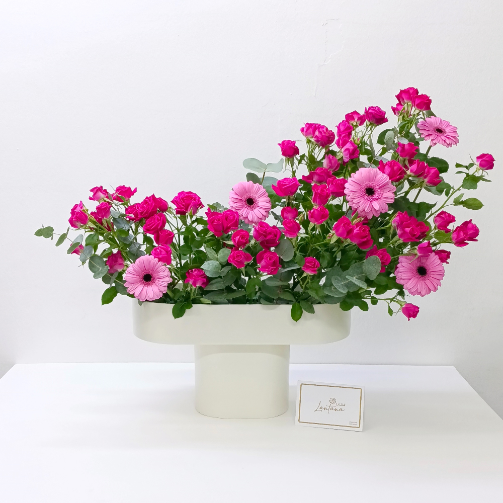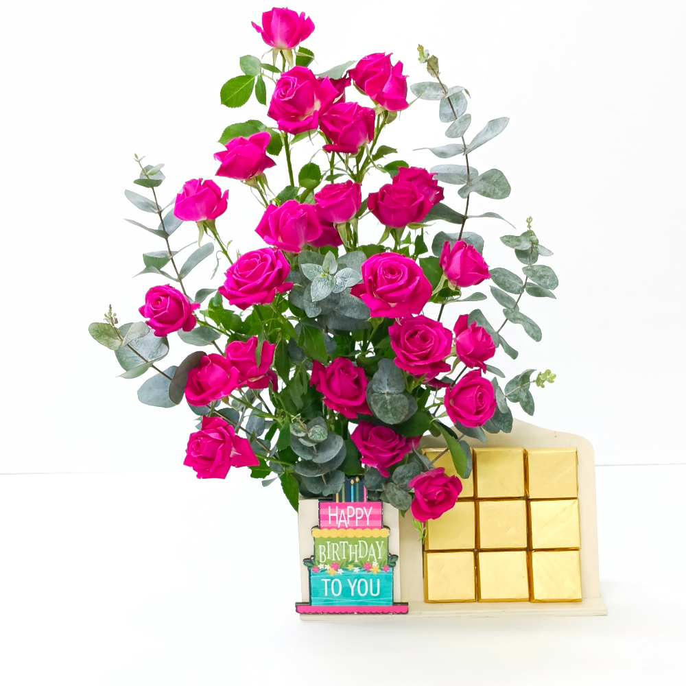 This bouquet contains a wooden stand arrangement of roses and gerbera.