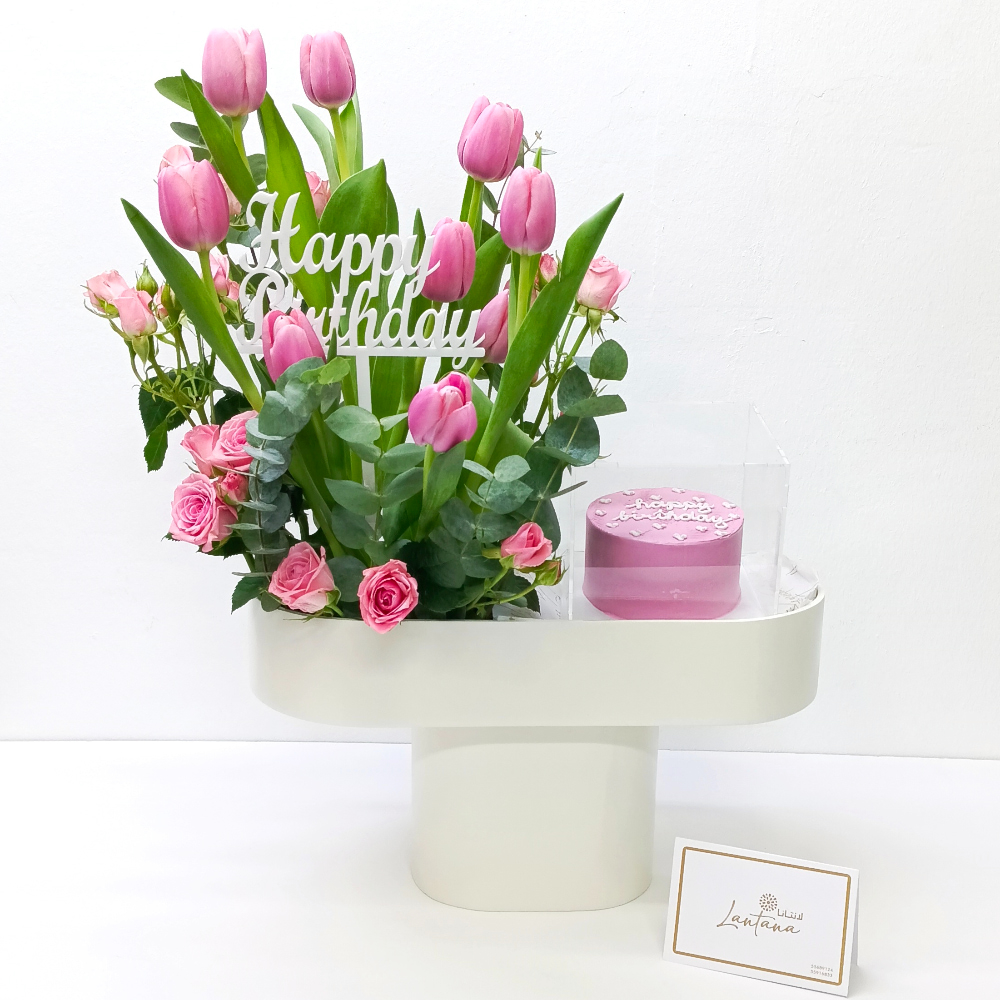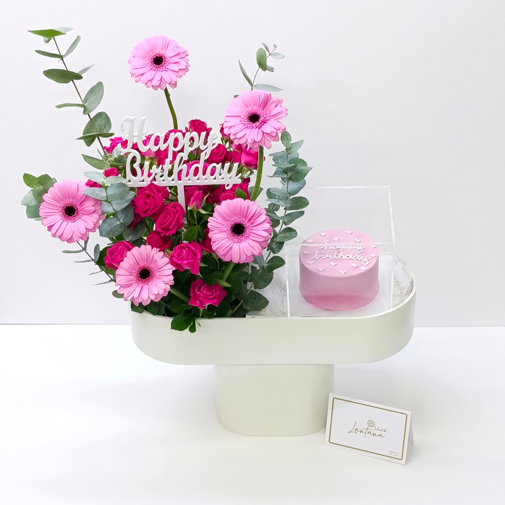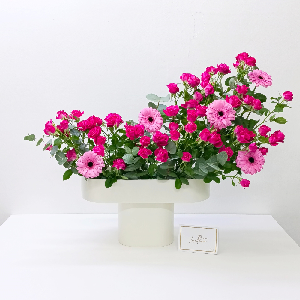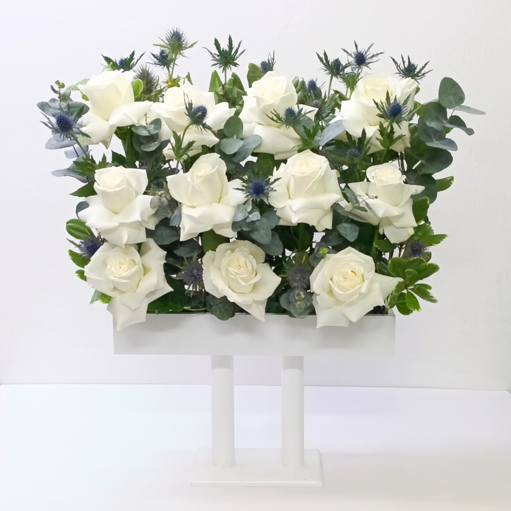 This bouquet contains a wooden stand arrangement of roses and gerbera.