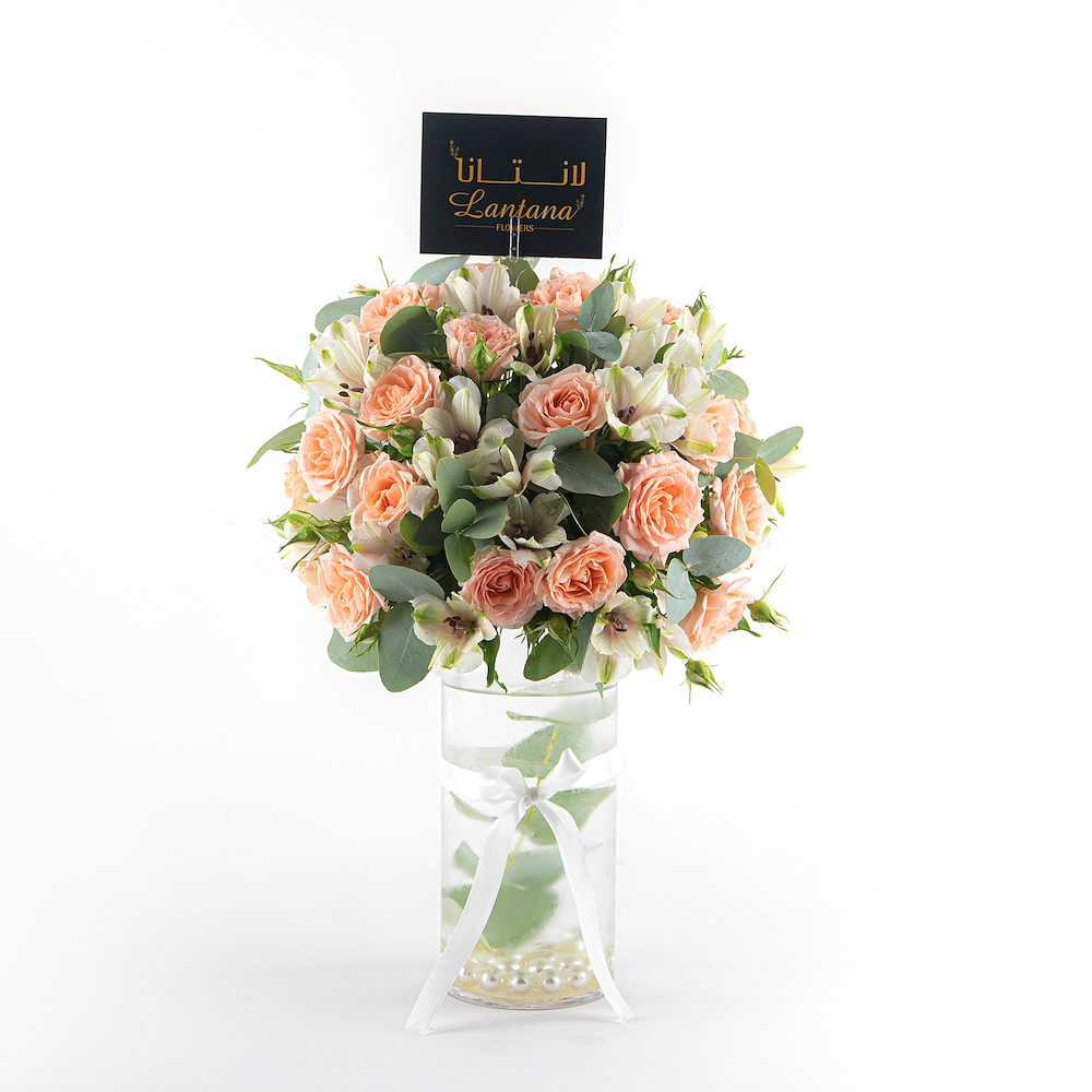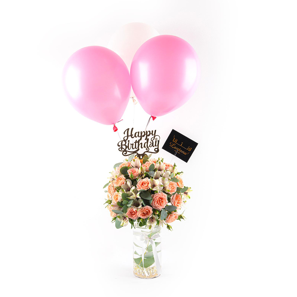 A stand filled with baby roses, gerbera, and hydrangeas with chocolates.