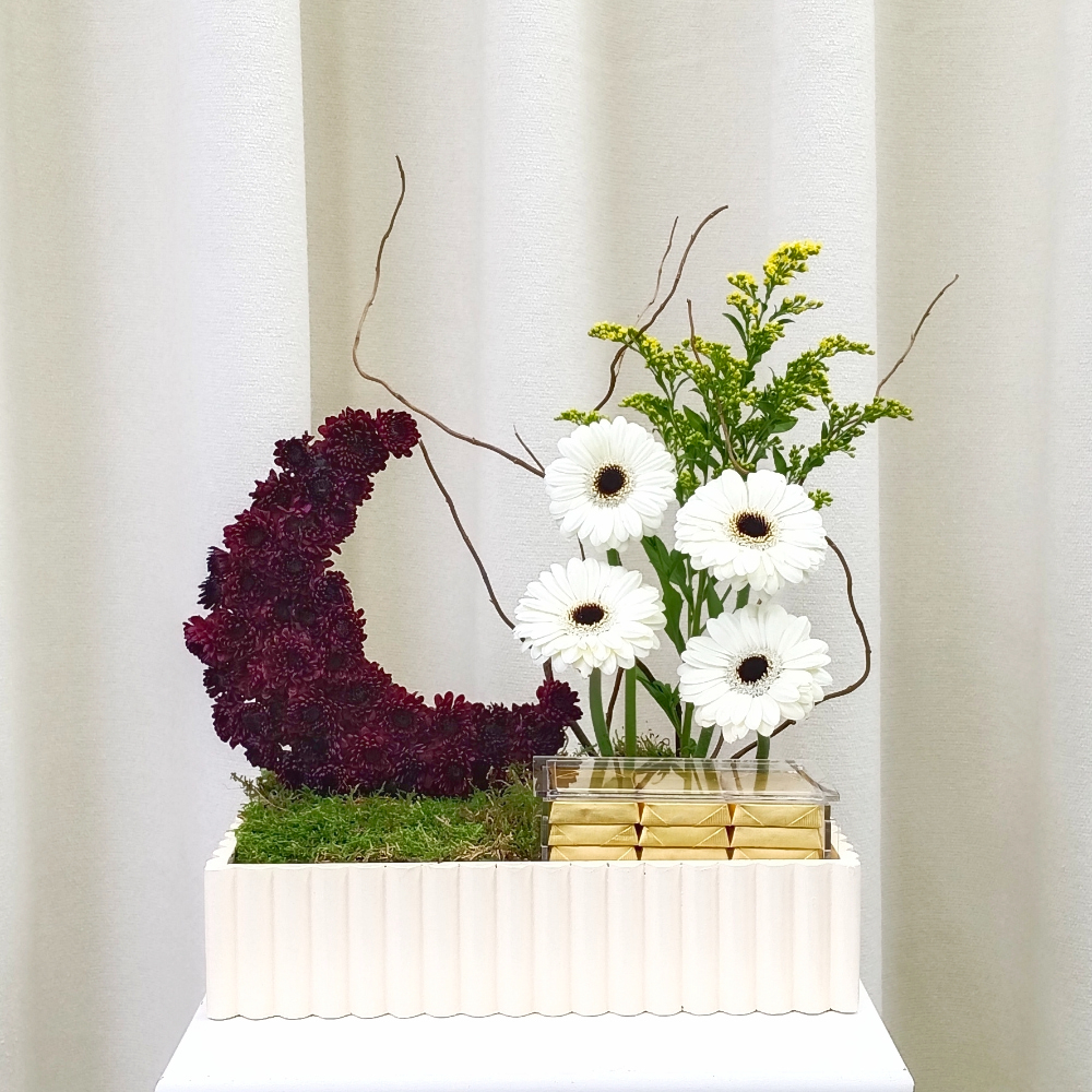 A bouquet containing gerberas and chrysanthemums, arranged beautifully in a tray with chocolates.