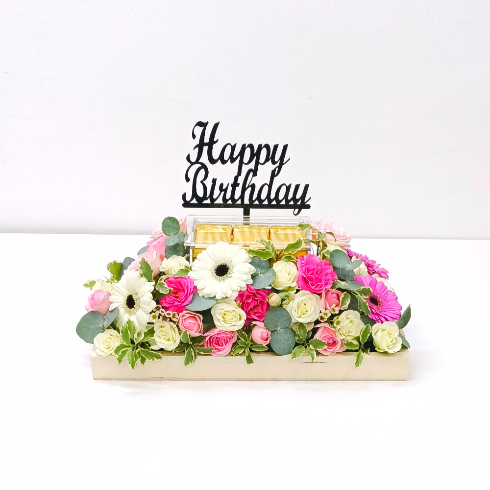 A bouquet containing roses, baby roses, and gerberas, arranged beautifully in a tray with chocolates.