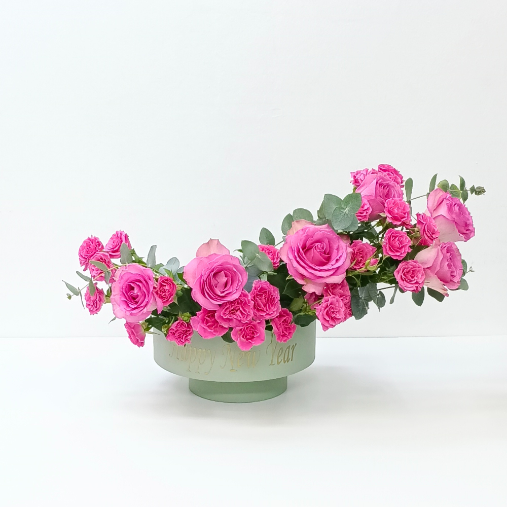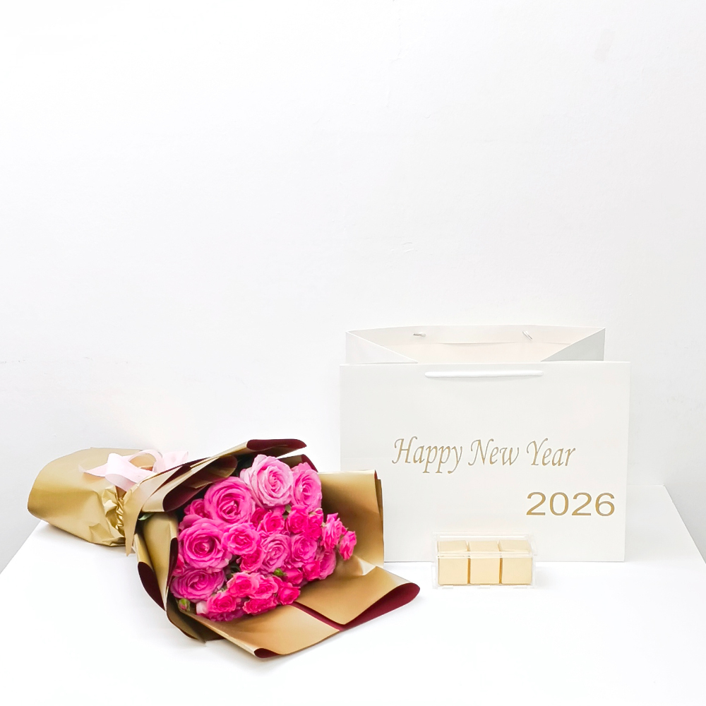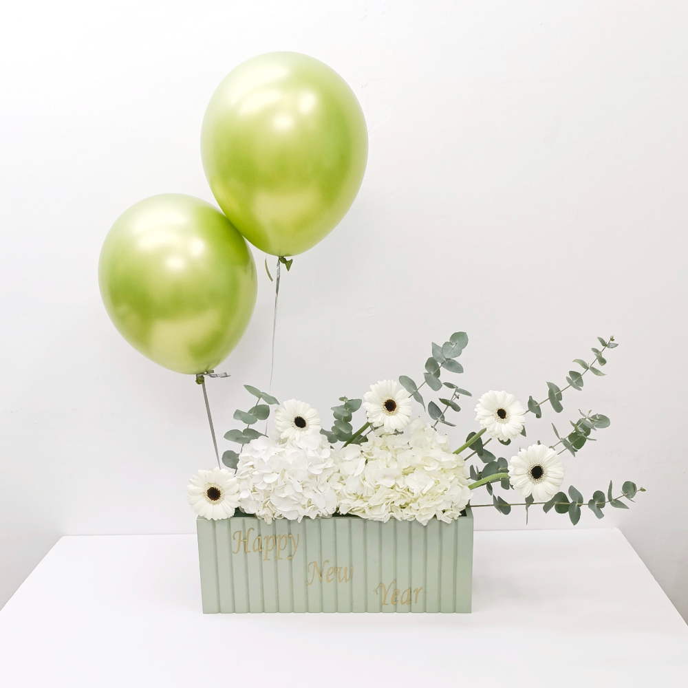 This bouquet contains white hydrangea and gerbera with 2 balloons for New Year.