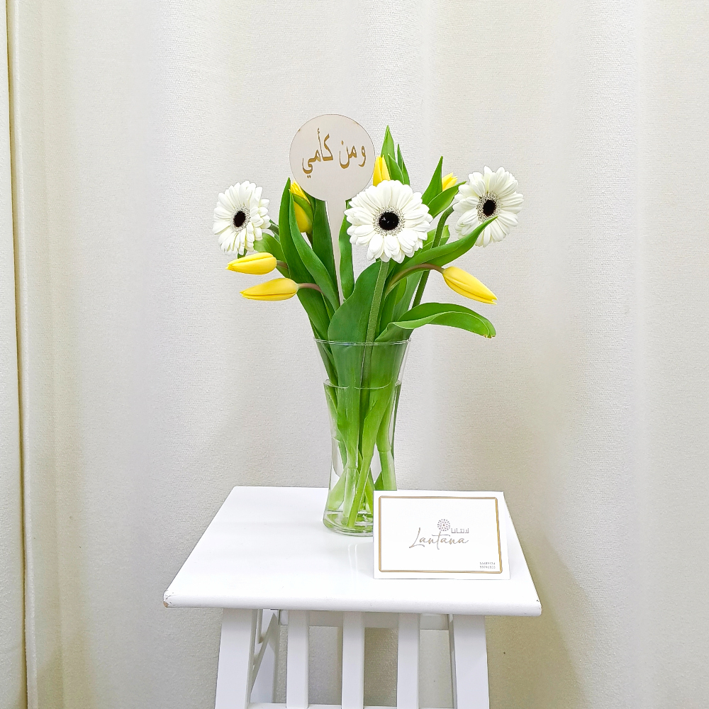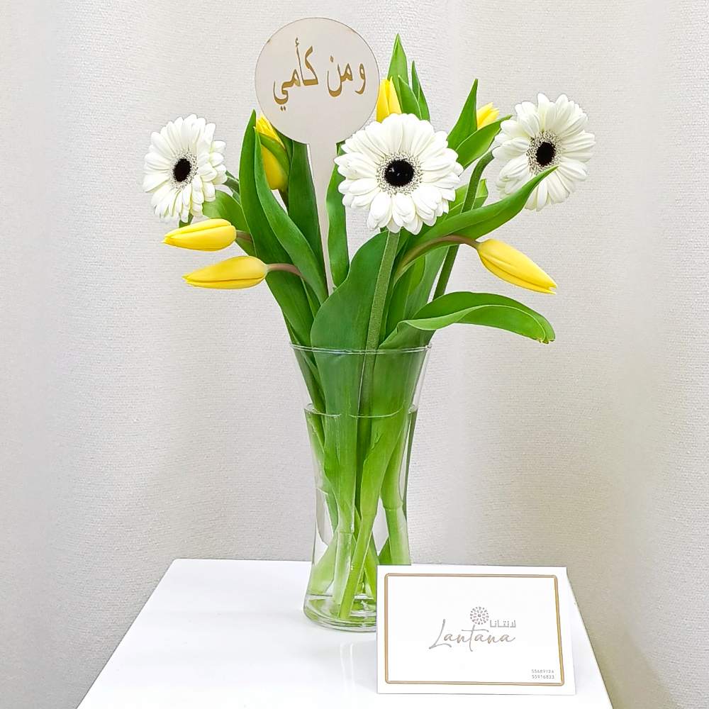 A bouquet containing gerberas and tulips, arranged beautifully in a glass vase.