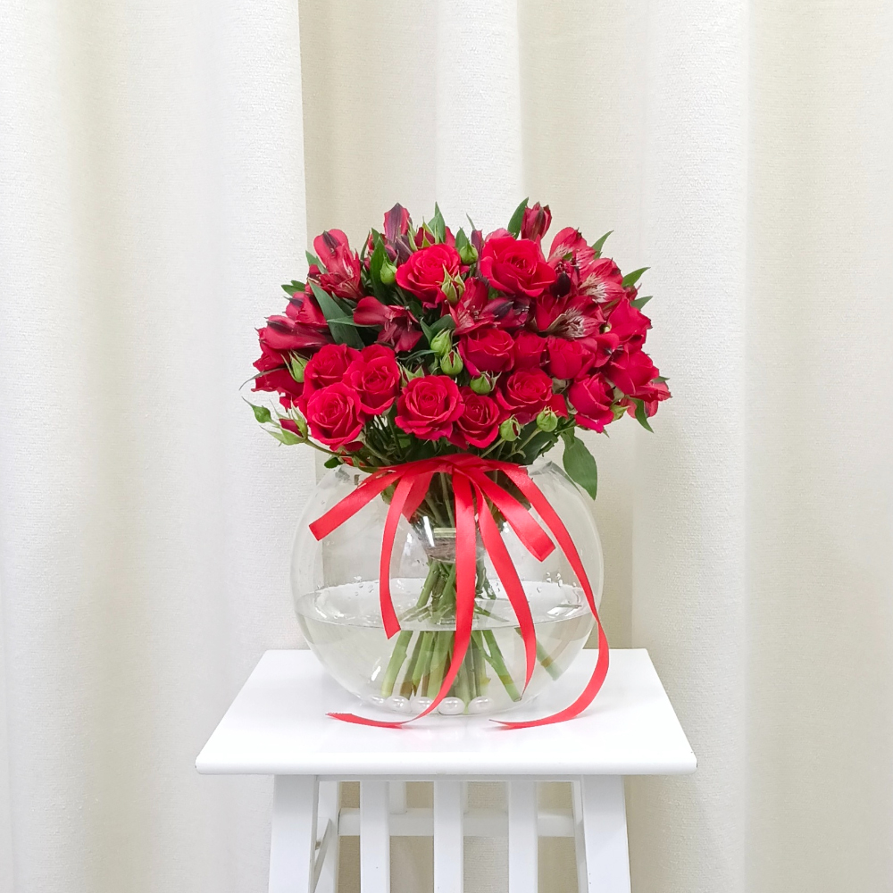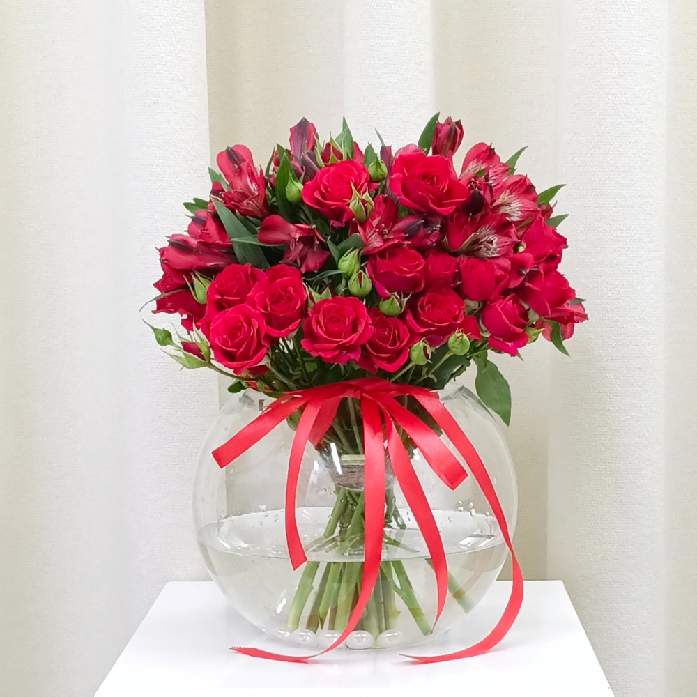A bouquet of red roses and alstroemerias, beautifully arranged in a glass vase for an elegant display.