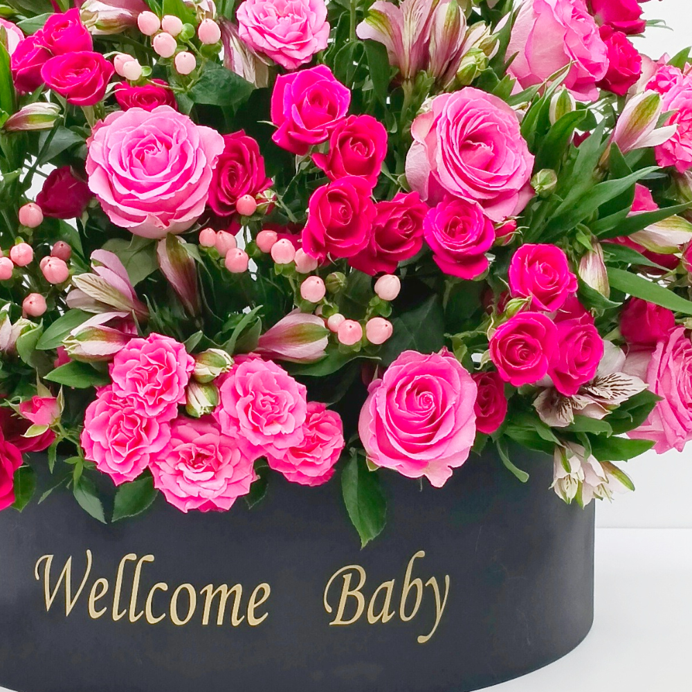 A bouquet containing roses, baby roses, and alstroemerias, arranged beautifully in a wooden box.