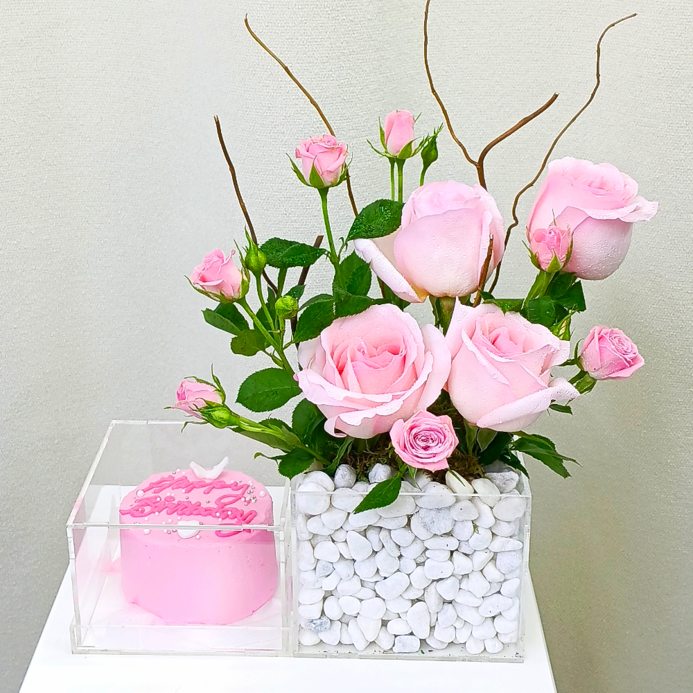 A bouquet containing pink roses and baby roses with a mini cake, arranged beautifully in an acrylic box.
