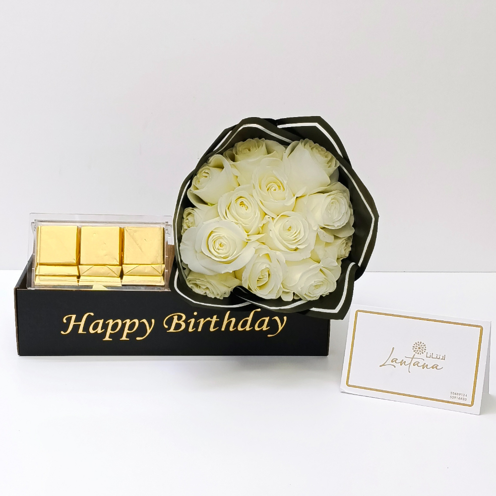 A bouquet that contains roses along with chocolates.