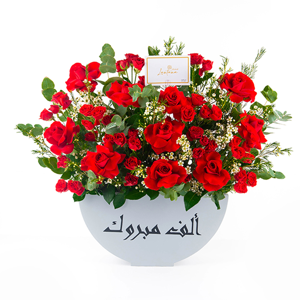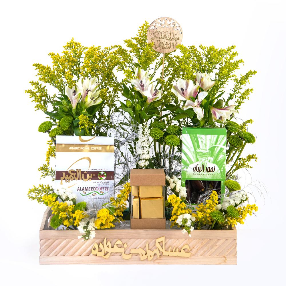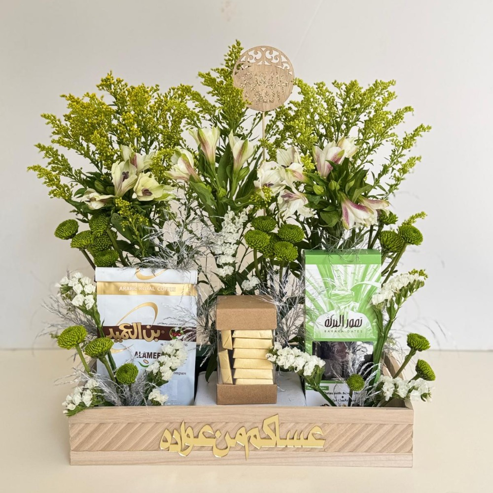A bouquet of alstroemeria with coffee dates chocolate on a wooden tray.
