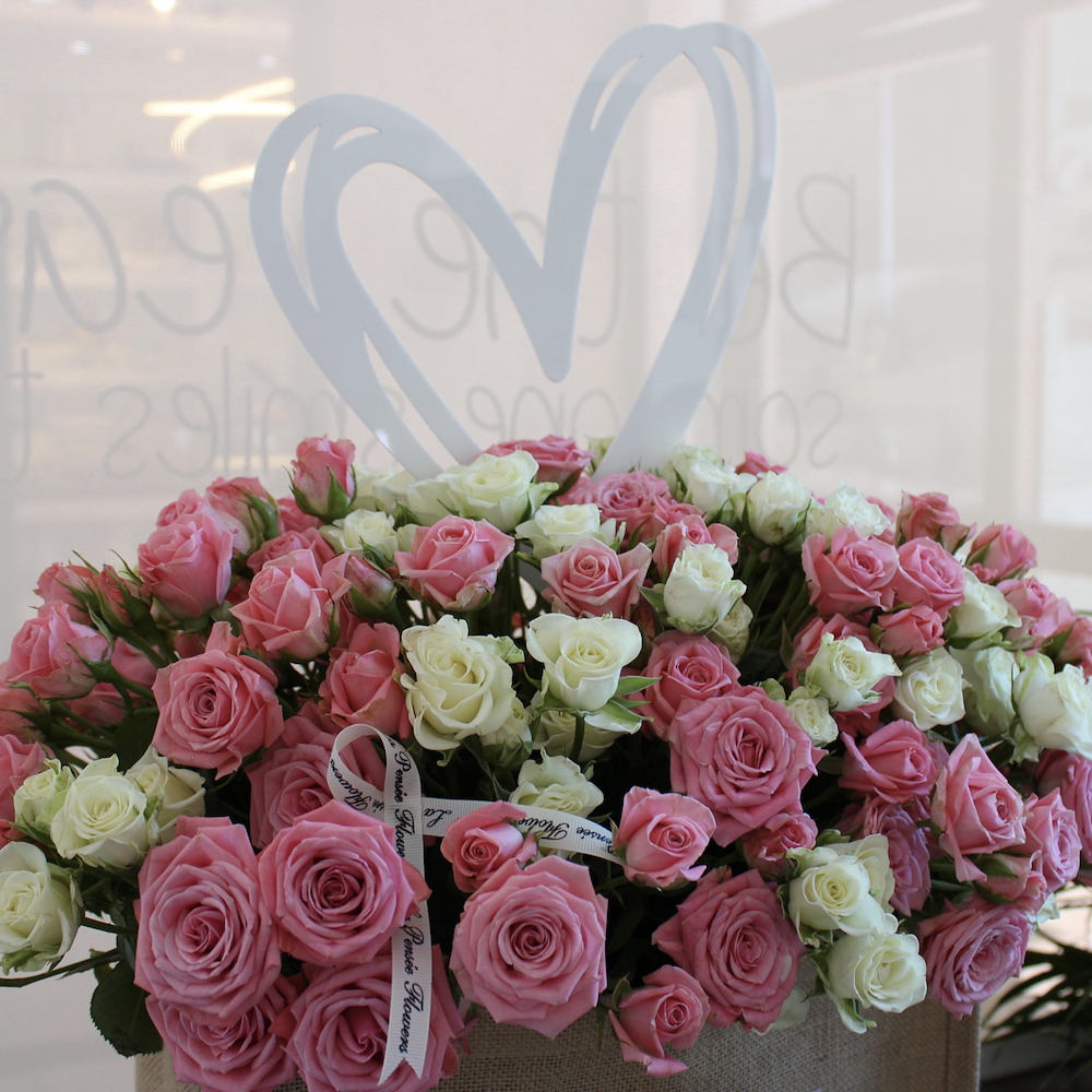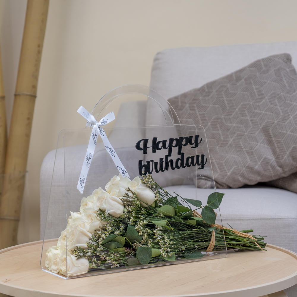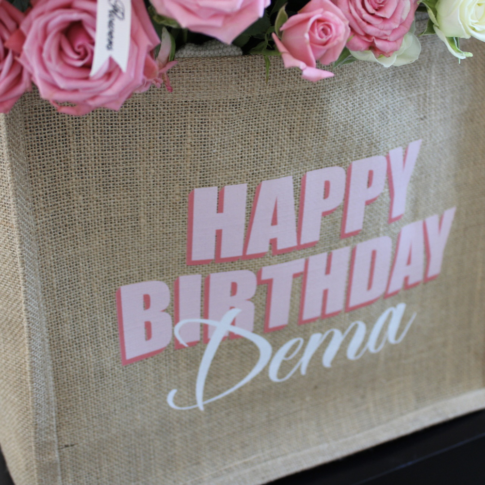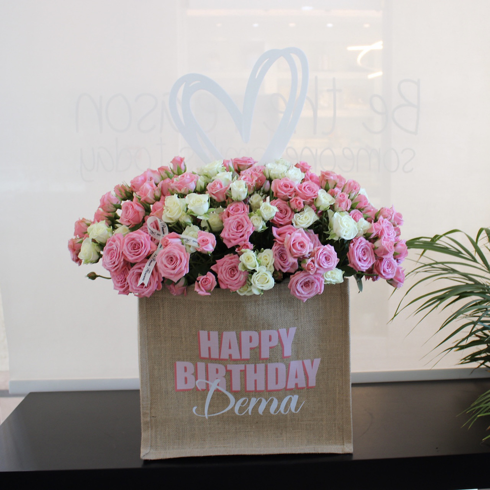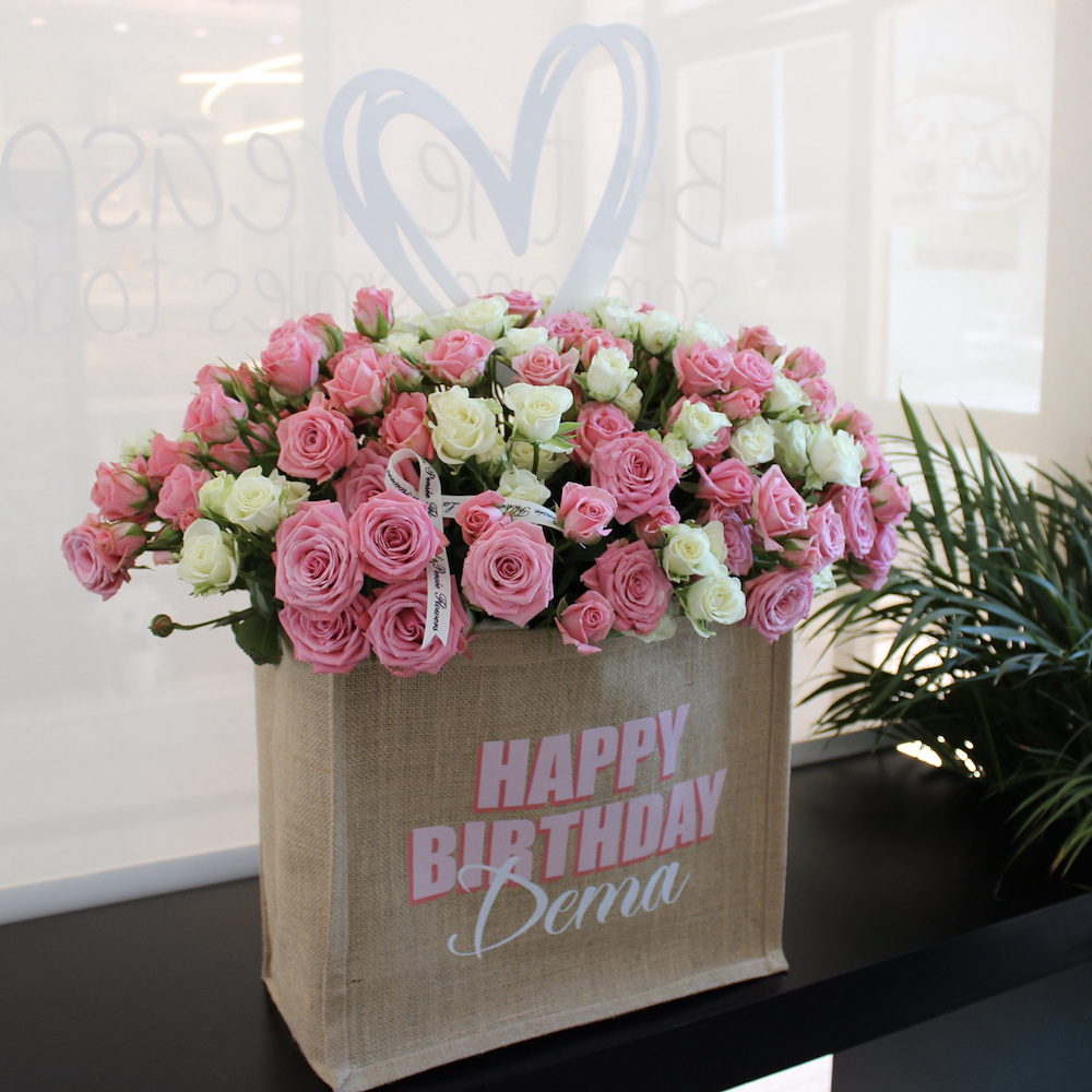 A fabric bag with white and pink flowers and white acrylic heart on top.