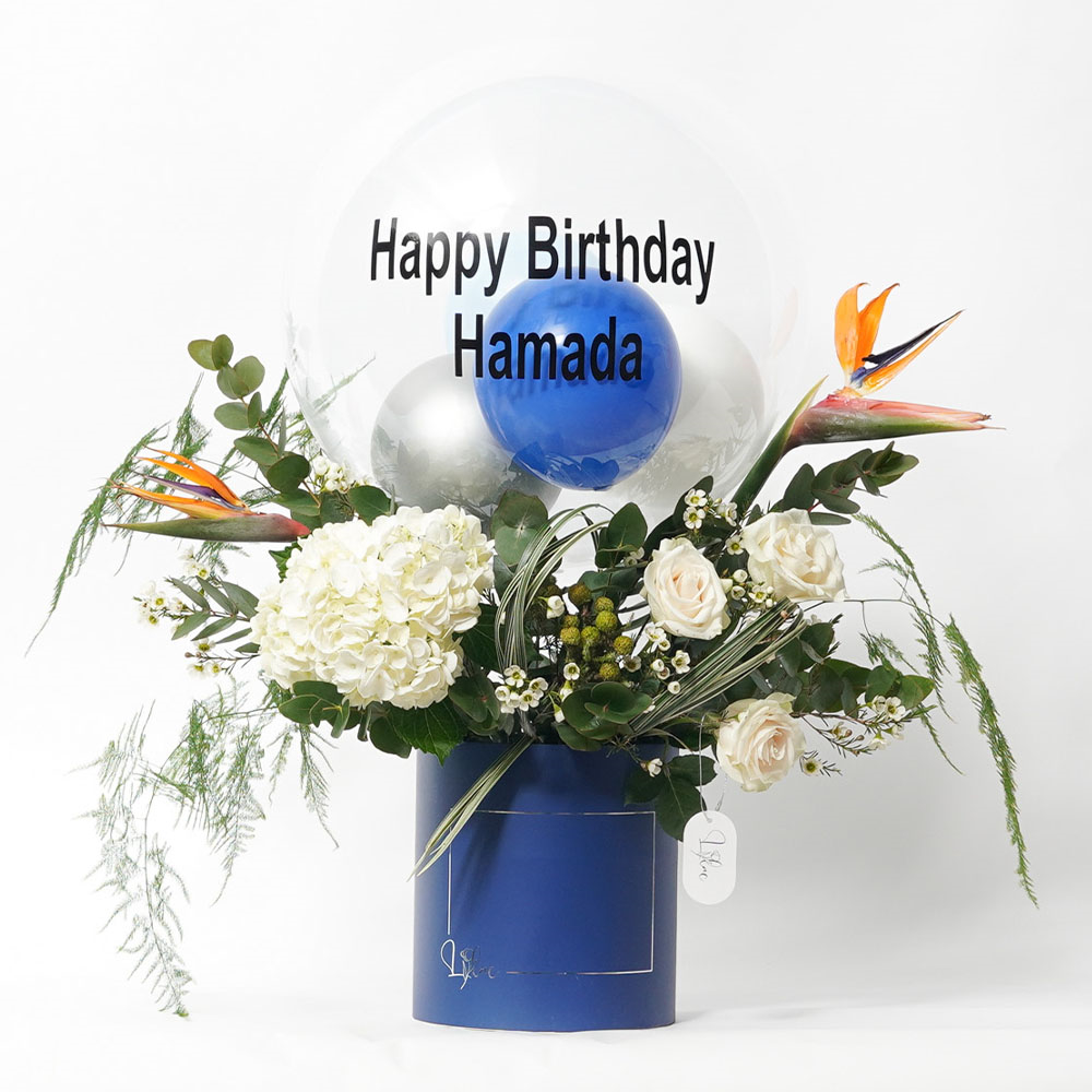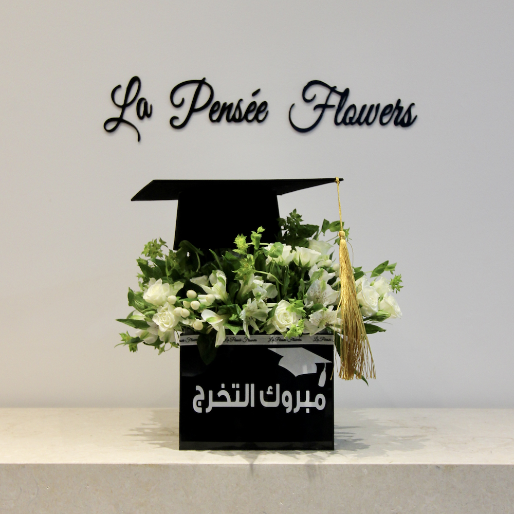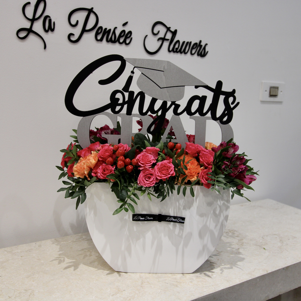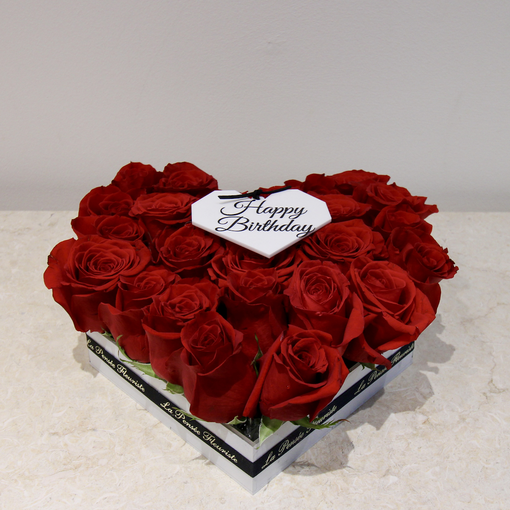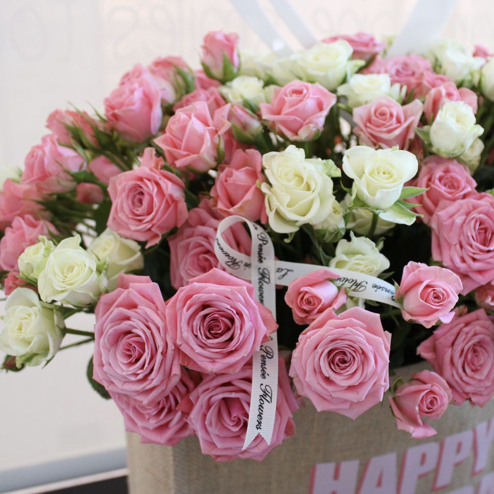 A fabric bag with white and pink flowers and white acrylic heart on top.