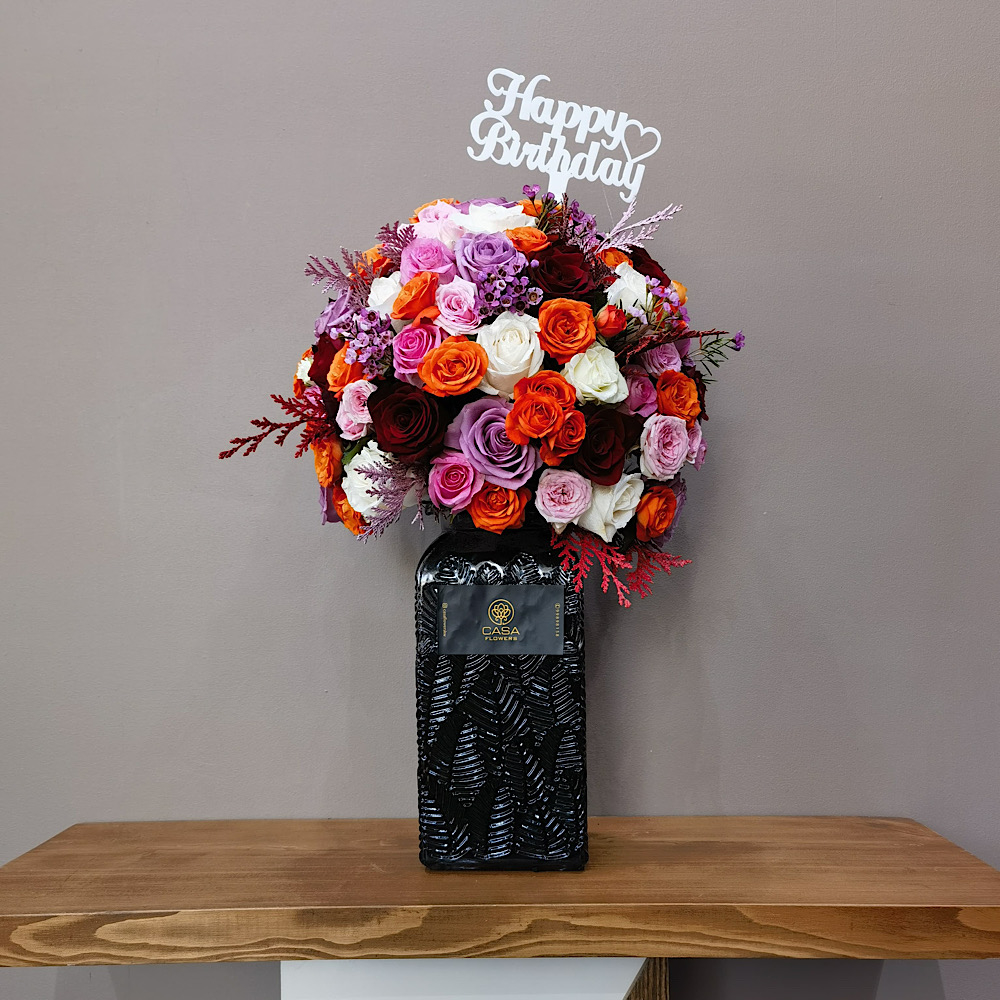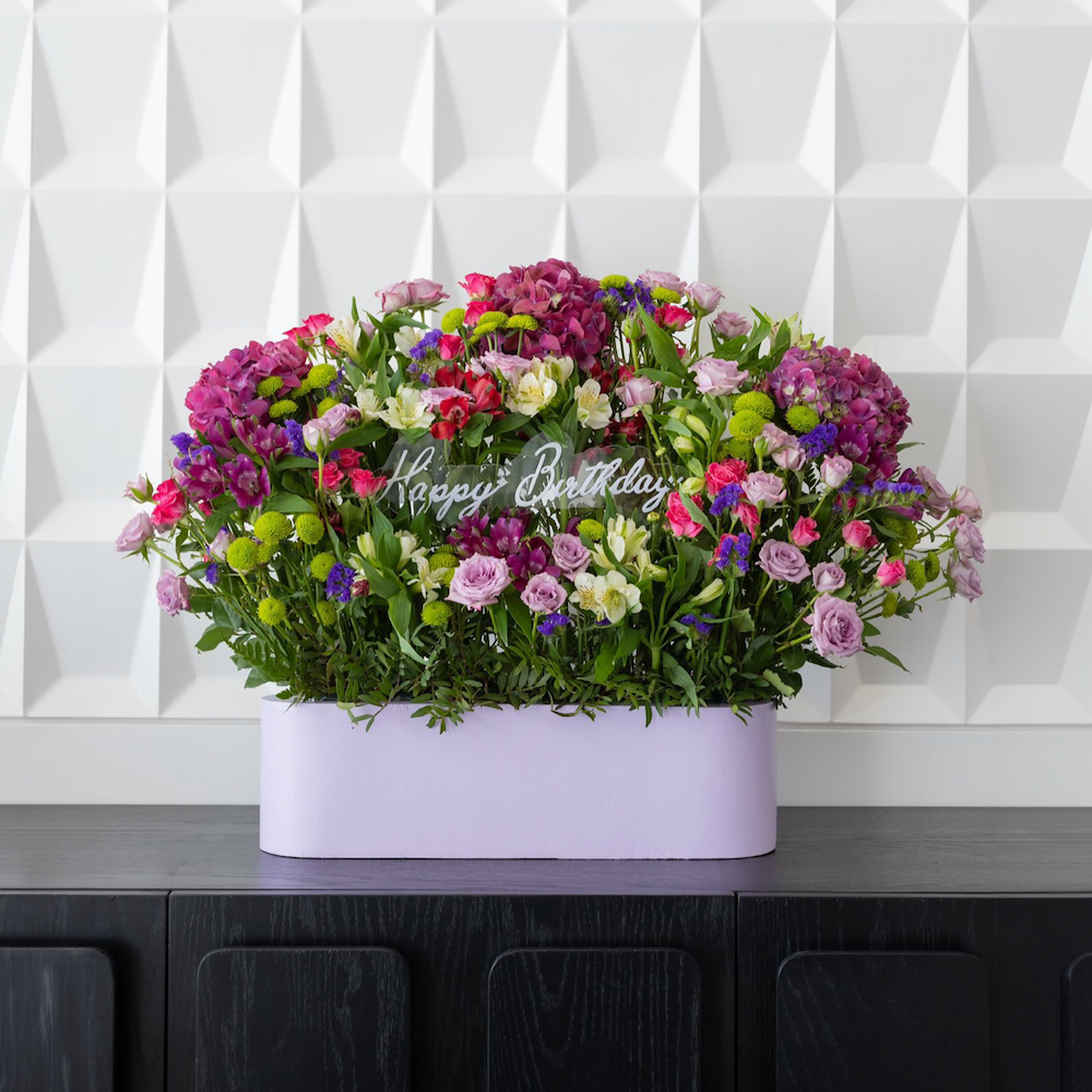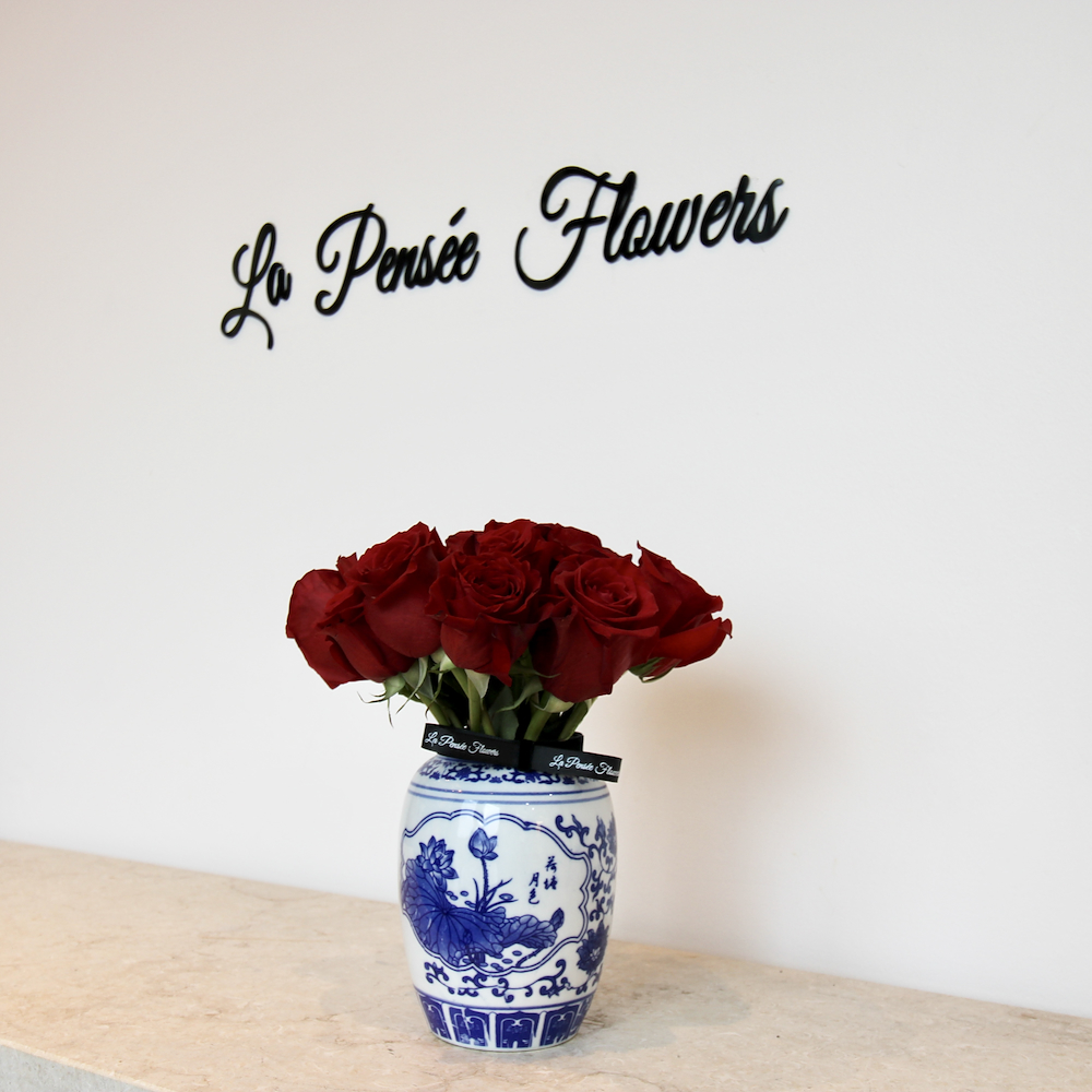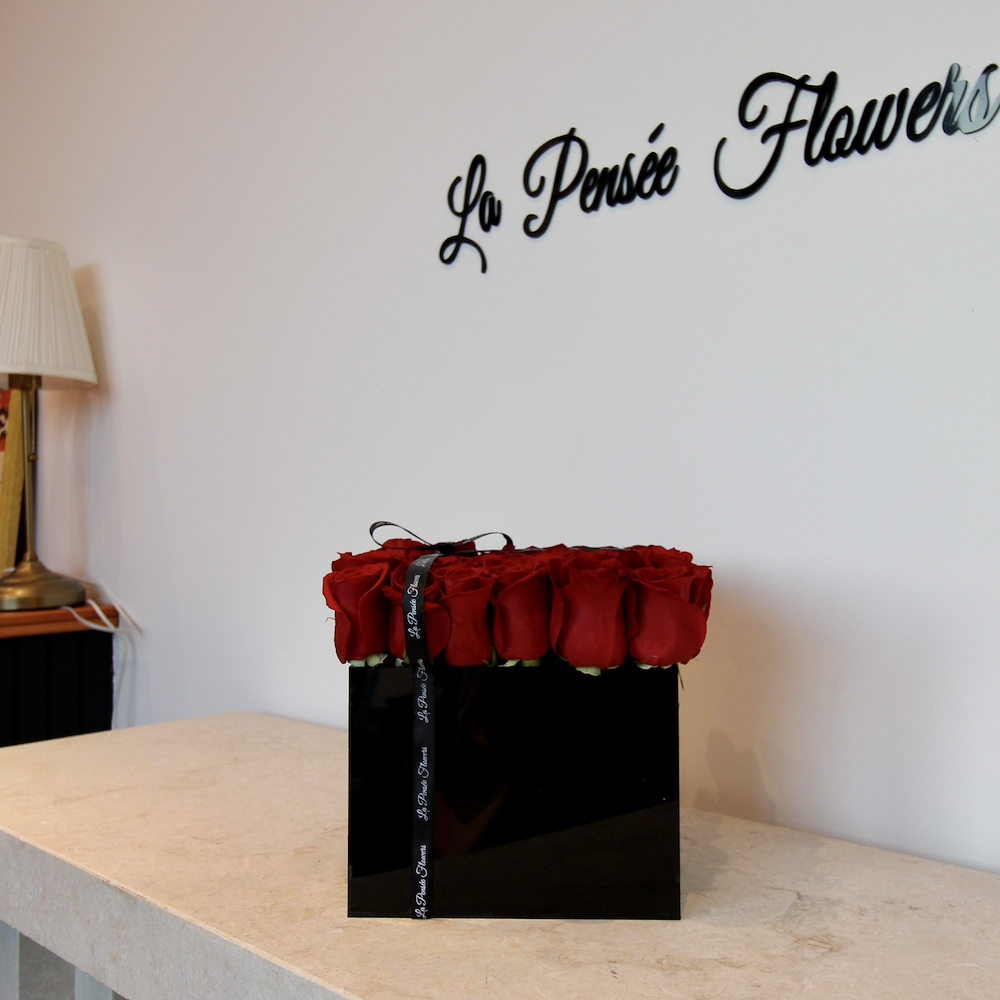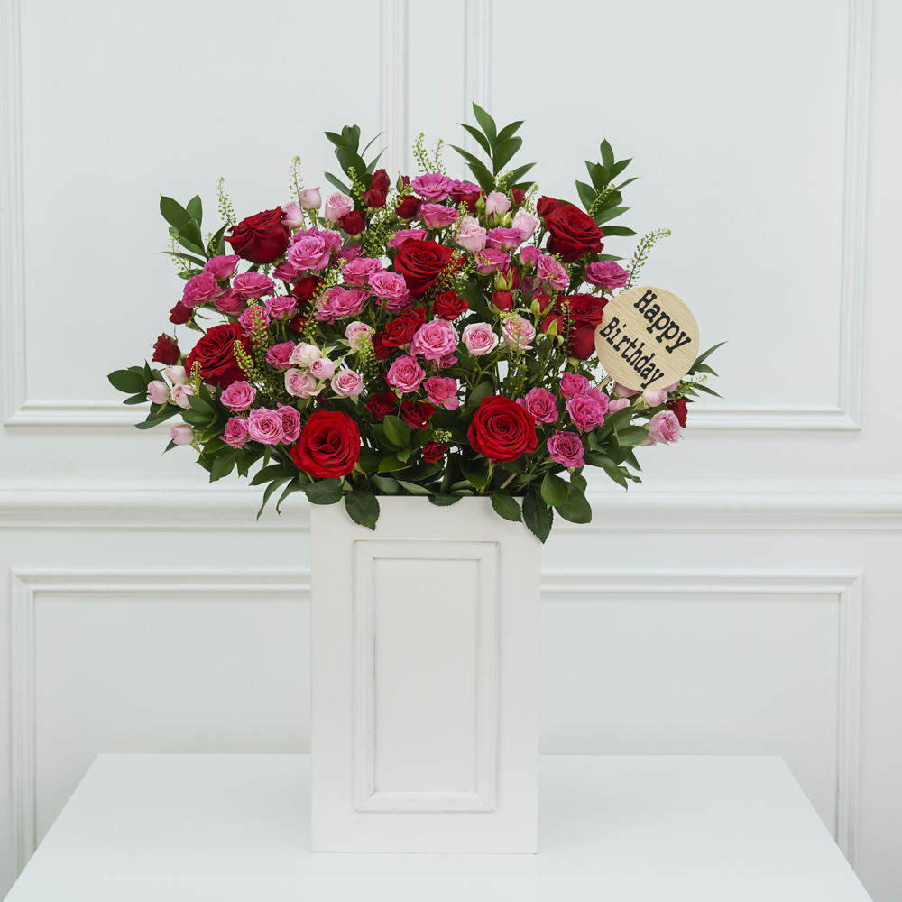 A fabric bag with white and pink flowers and white acrylic heart on top.