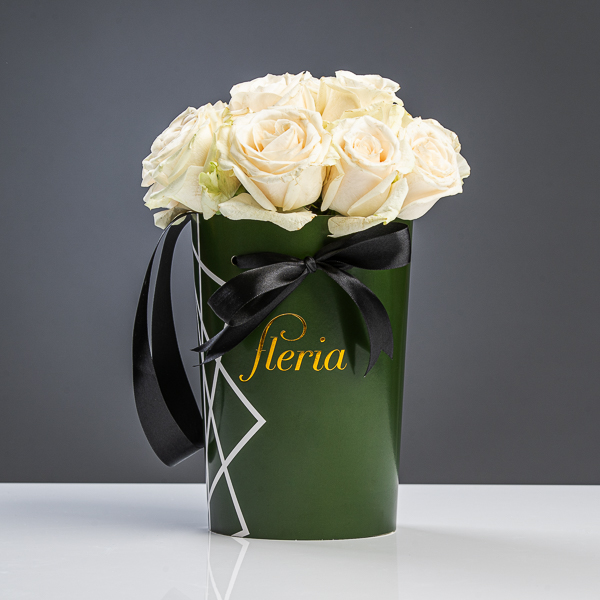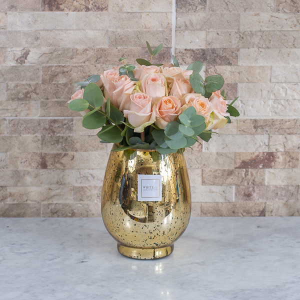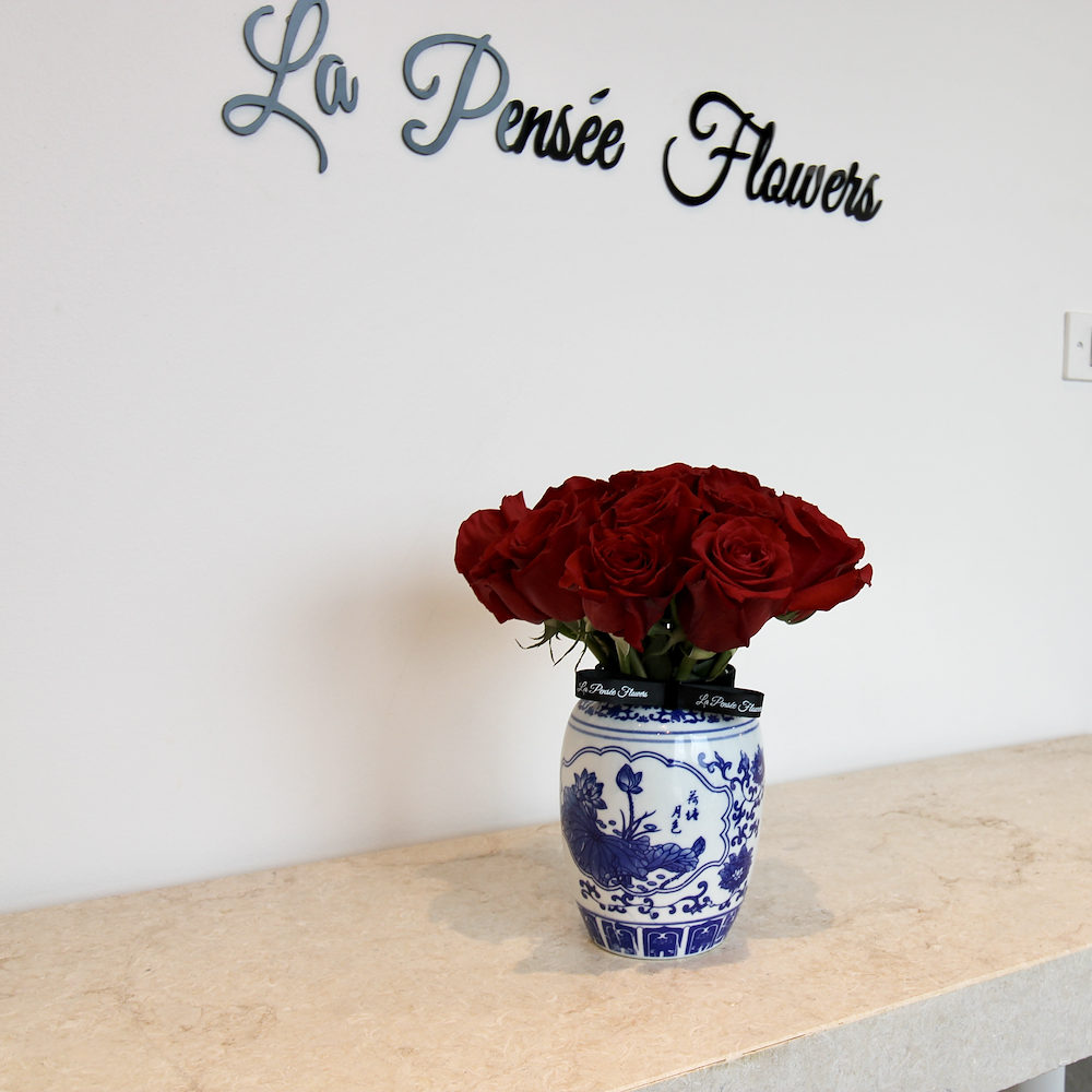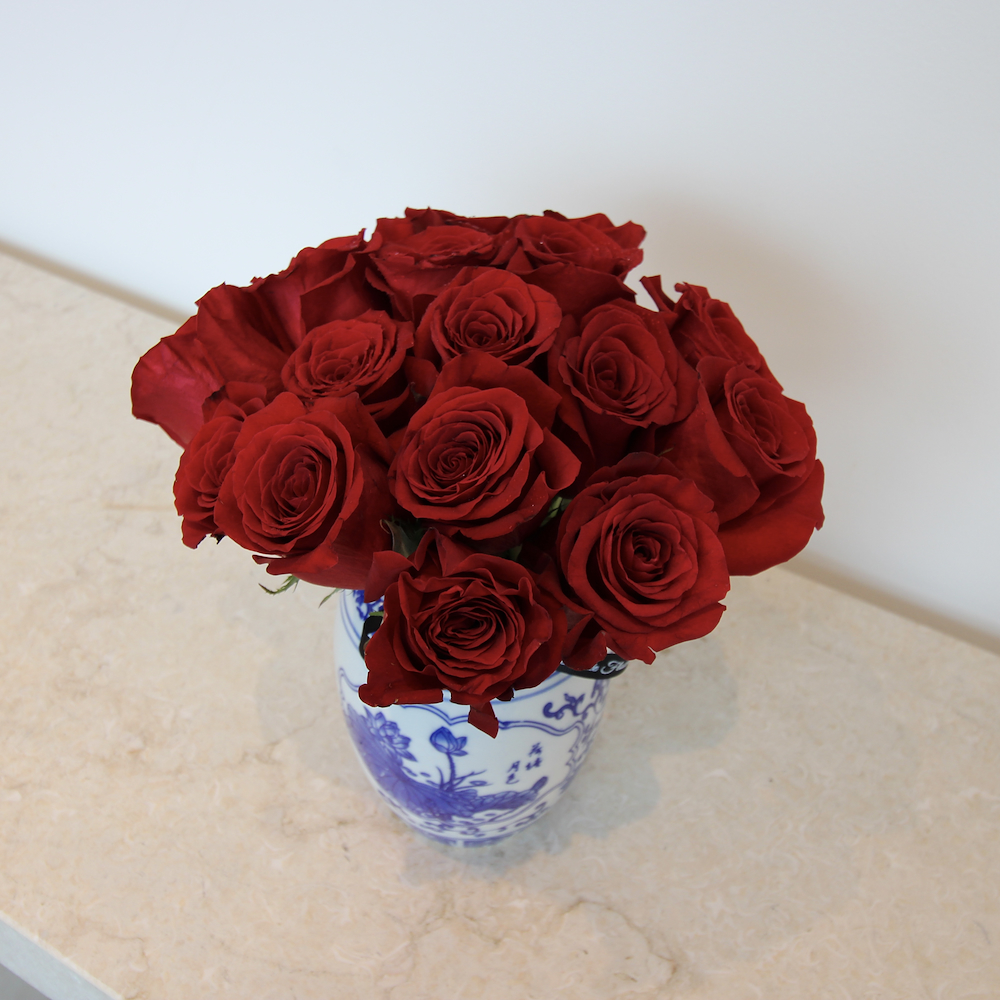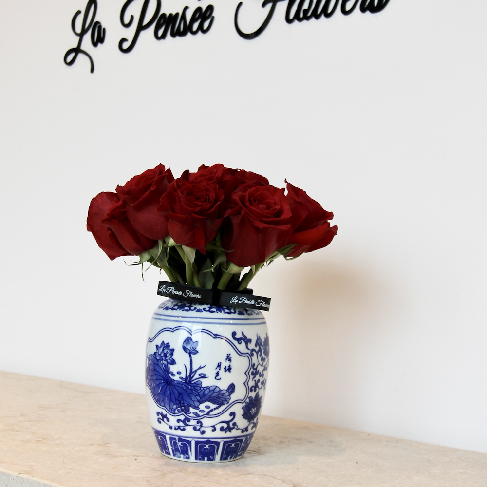 A bouquet containing red roses arranged beautifully in a ceramic vase.
