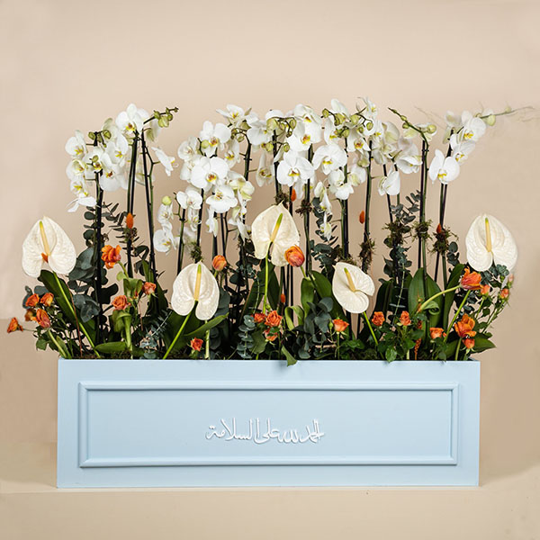 A wooden vase contains orchid plants, and anthurium & baby roses. You can request the desired name.