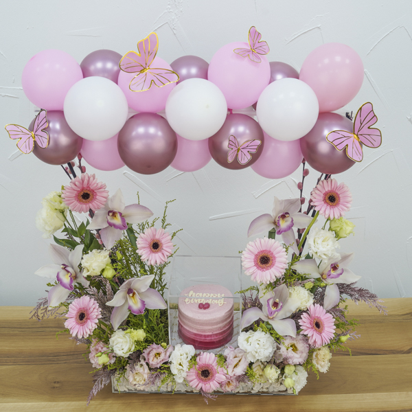 A bouquet that contains tulip and dried flowers with a cake in an acrylic box. Order 1 day in advance.