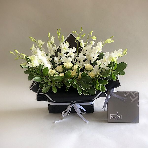 The arrangement contains baby roses, an acrylic base, and a box of chocolates.
