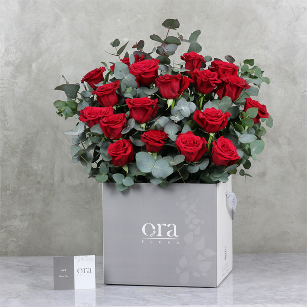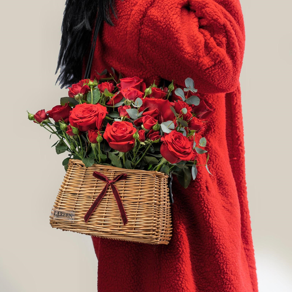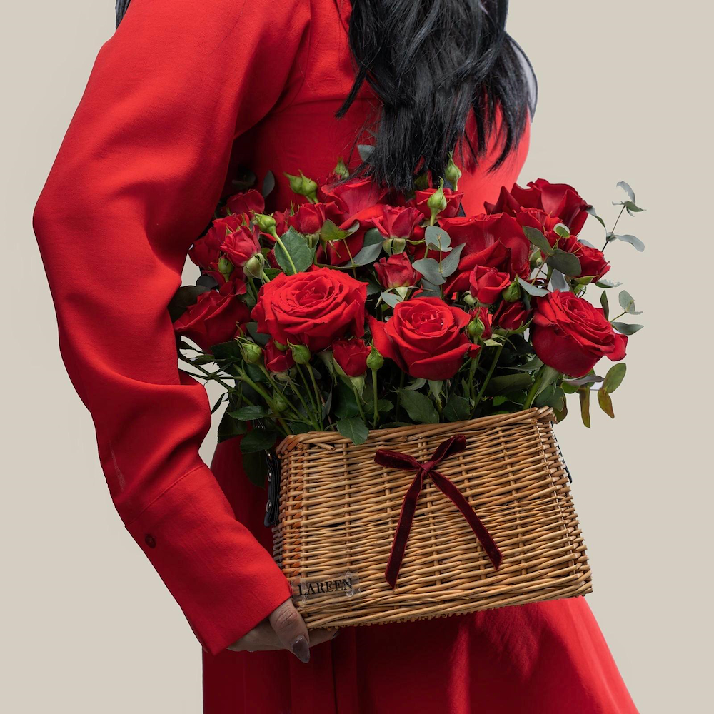 The arrangement includes a multi-use basket containing red roses and baby roses.