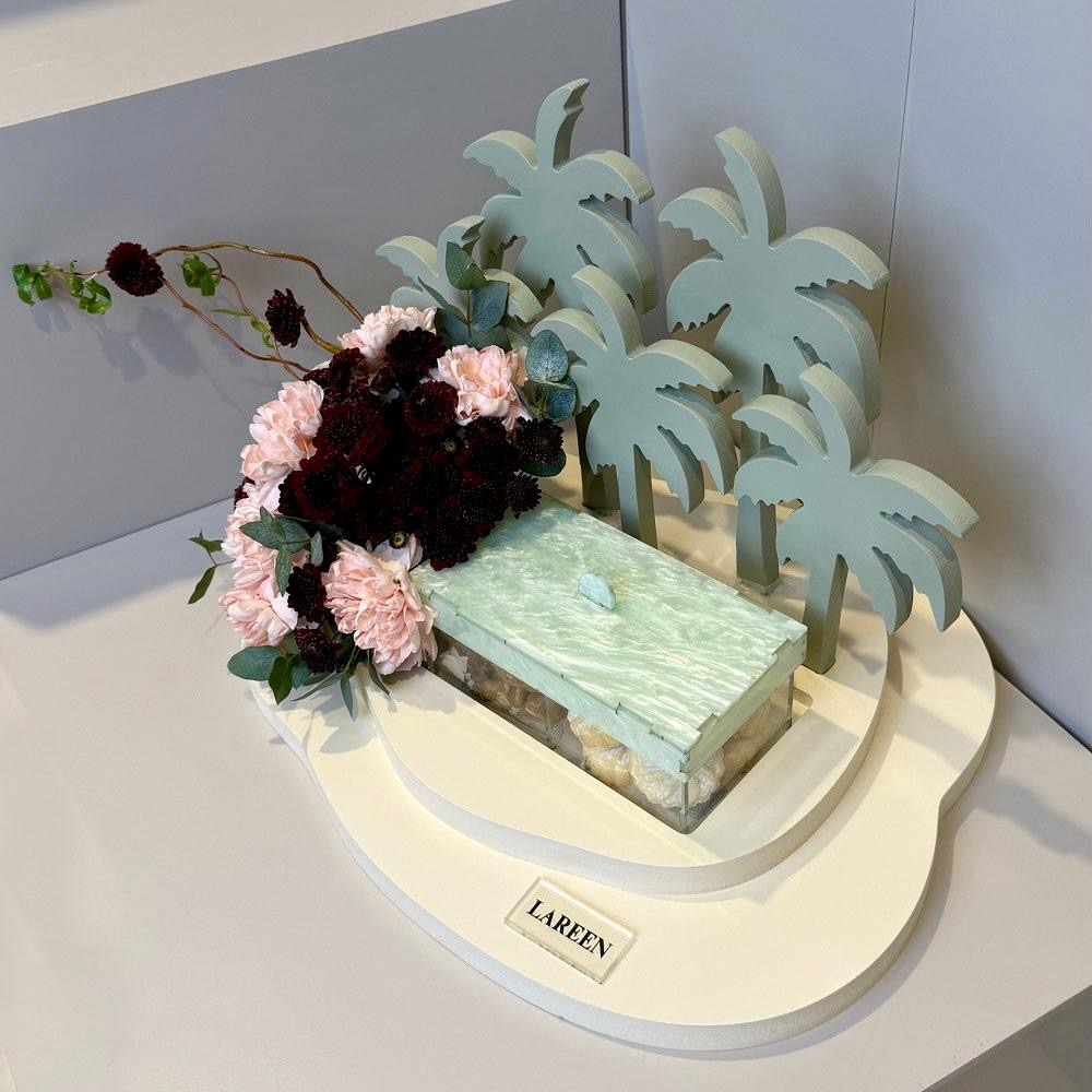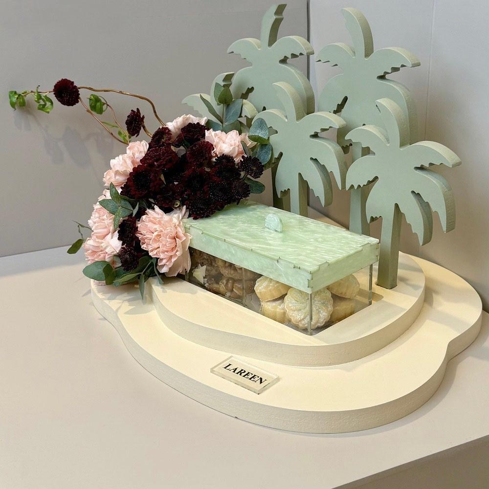 An elegant wooden stand filled with mix of flowers of carnations, craize, and an acrylic box of maamoul and ranqina sweets.