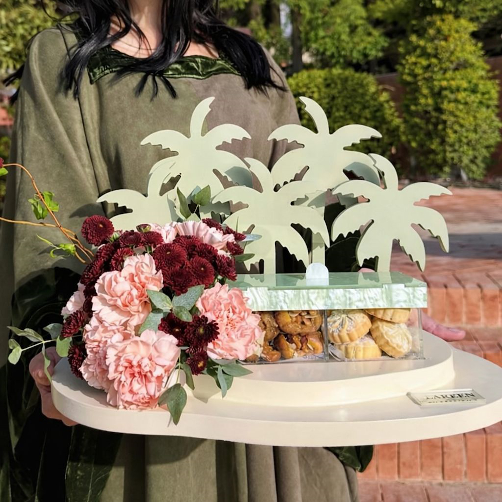 An elegant wooden stand filled with mix of flowers of carnations, craize, and an acrylic box of maamoul and ranqina sweets.