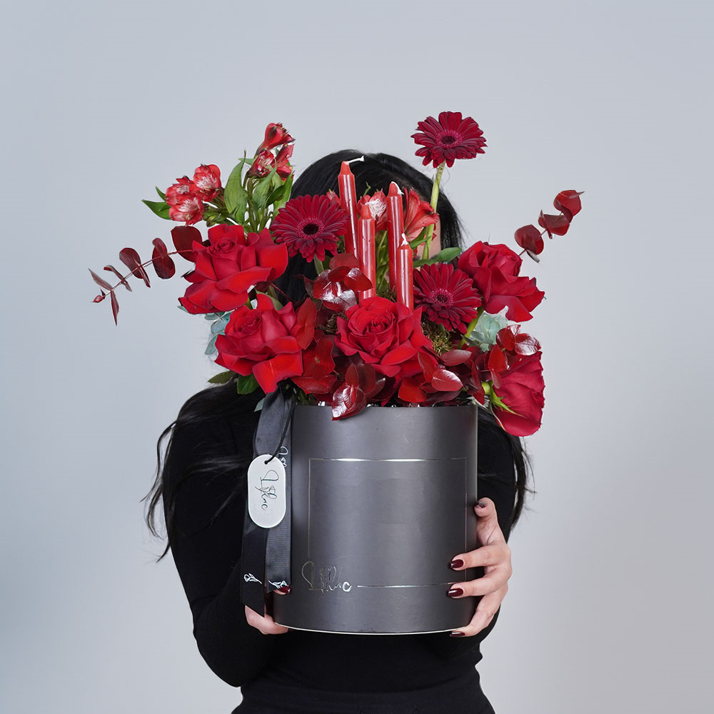 An elegant black box, featuring a luxurious arrangement of roses, gerberas, and alstroemeria, accented with red candles in the center for a warm, refined touch.