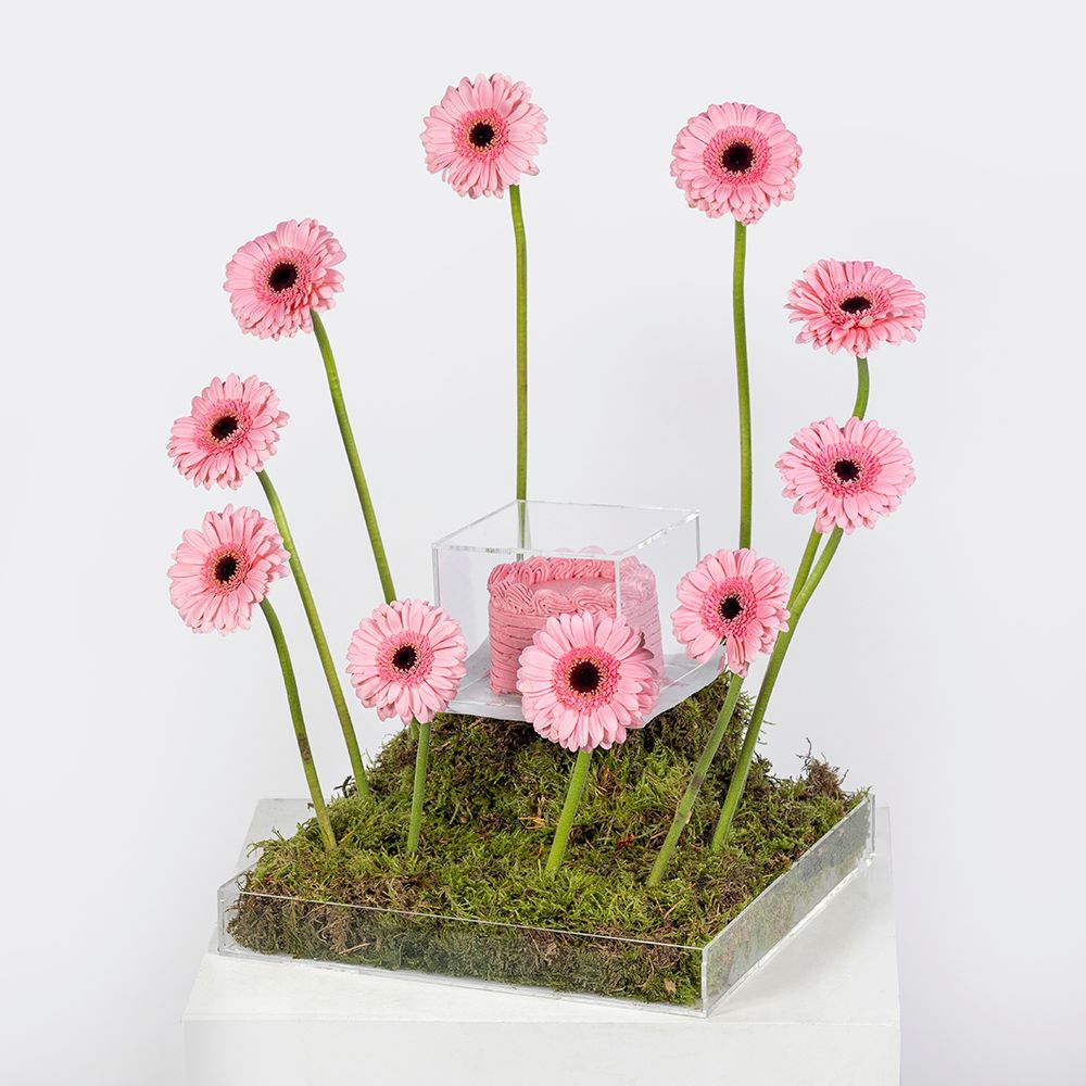 This beautiful tray contains pink gerbera flowers with a cake. You can customize your cake writing in English only.